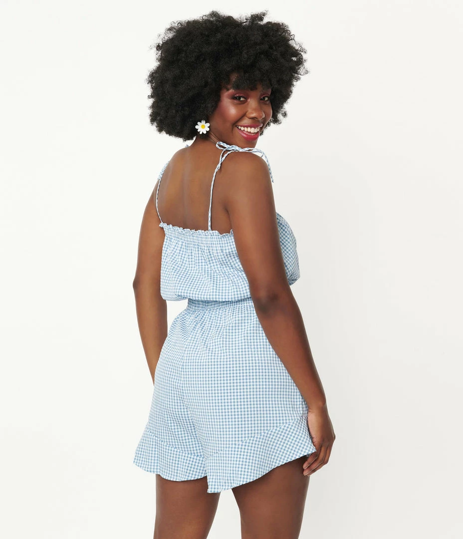 Spring picnic perfection! This adorable romper is crafted in a light blue and white gingham crepe fabric. The straight neckline is secured with a smocked ruffle and sweet spaghetti straps with self tie bows. The smocked waistband hugs your curves while the loose fitting shorts feature a sweet ruffled hemline!
