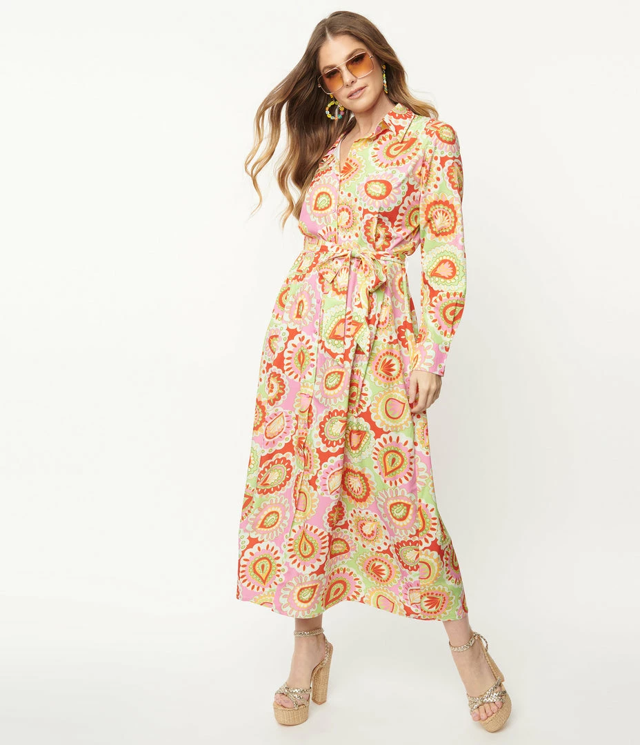 Here’s to stepping outside the boundaries, dears! Keep all eyes on you in this fabulous mid shirt dress, crafted in a lightweight woven fabric that dances with a fabulous retro paisley print in green, red, ivory, and pink. The button up front leads to a classic collar while the long sleeves drop into button cuffs. The seamed waist is cinched with a matching sash while the pleated midi skirt drops past the knees!