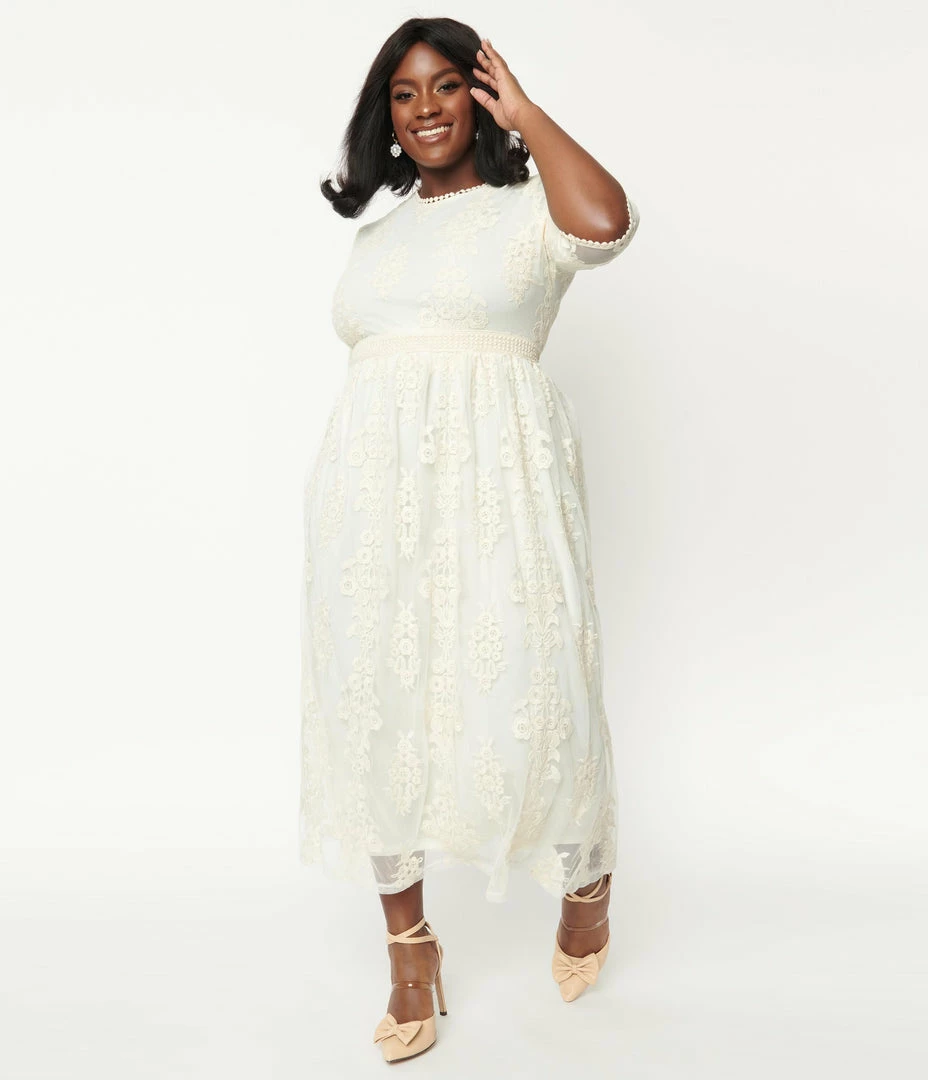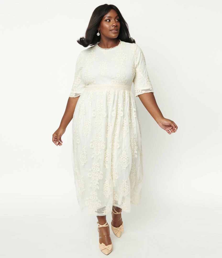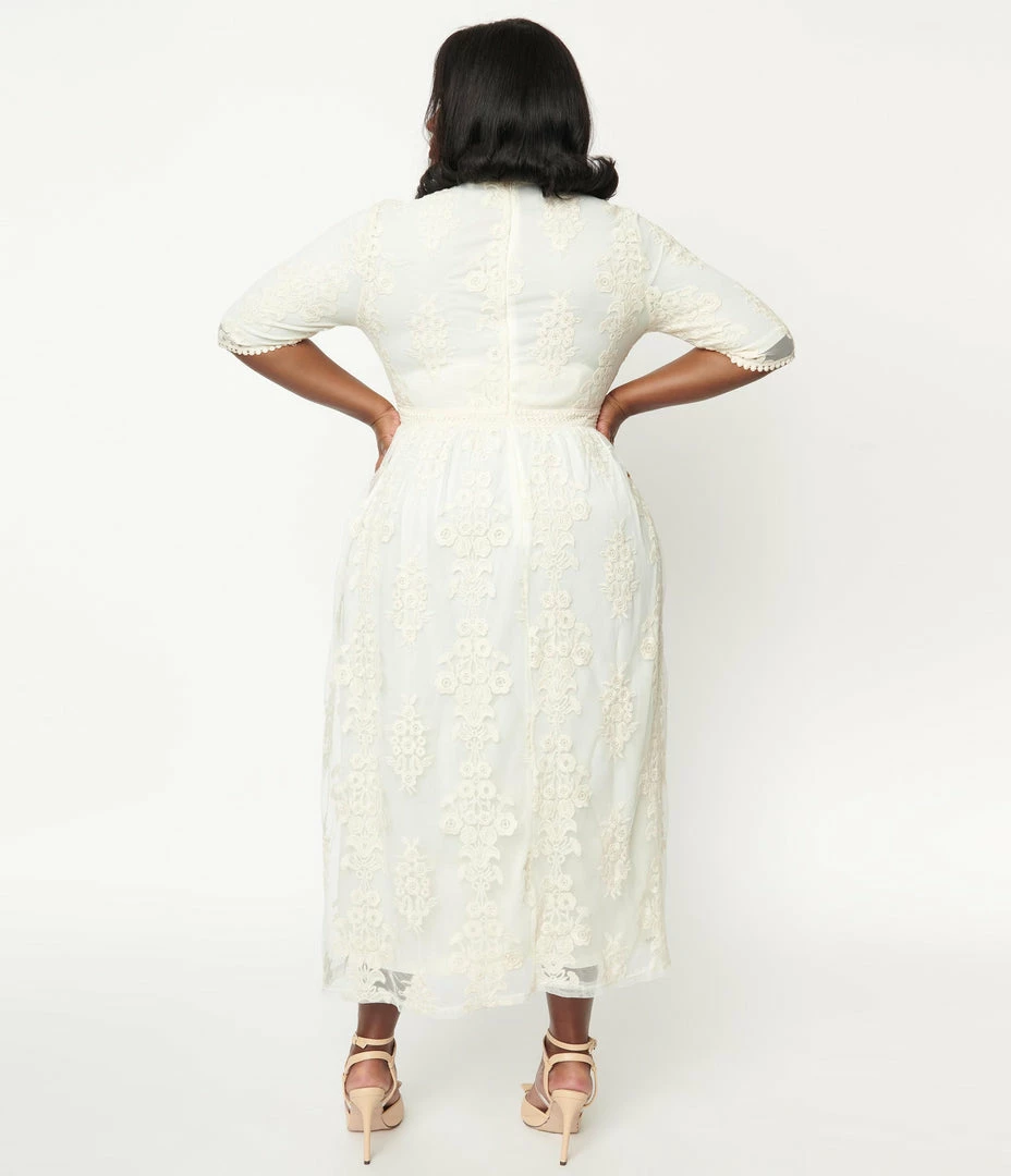 It’s a gala in embroidery, dears! An angelic plus size dress for a divine event, this heavenly ivory modest midi dress features vintage styling with a delicate mesh overlay that is embellished with embroidered antique ivory lace throughout. The modest high neckline is framed by sleek half sleeves while an intricate embroidered natural waistline nips in your figure. The flowing midi skirt cascades past your knees while a back zipper has you feeling confident and radiant! This ivory dress is the perfect choice for any vintage-loving bride and makes a beautiful tea length wedding dress!