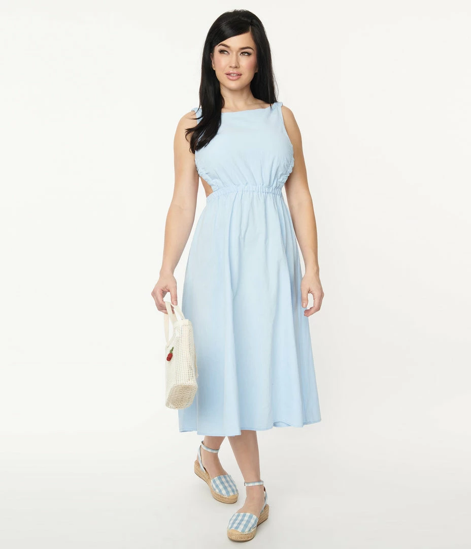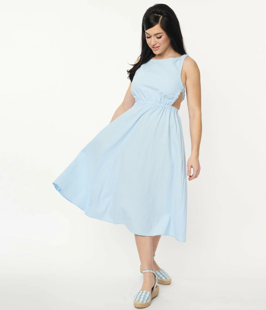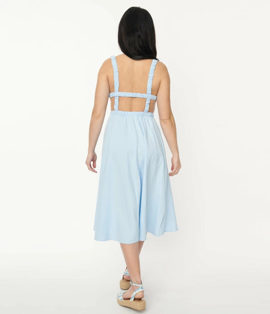 Sweep them off their feet, darling! This adorable dress is crafted in a light blue textured woven fabric. The modest scoop neckline is secured with elastic shoulder straps and drops to a sultry open back design, framed by the sleeveless silhouette. The banded waist is nipped in by elastic while the A-line midi skirt dances above your ankles!