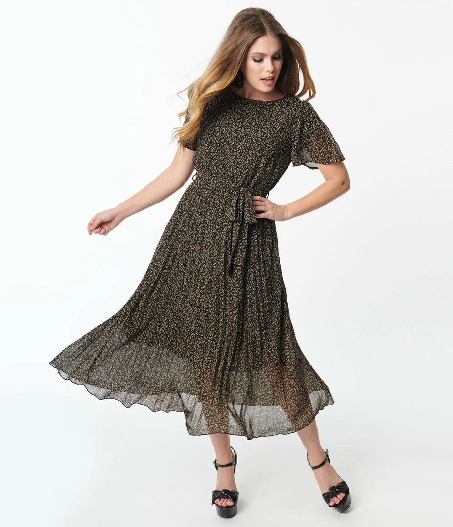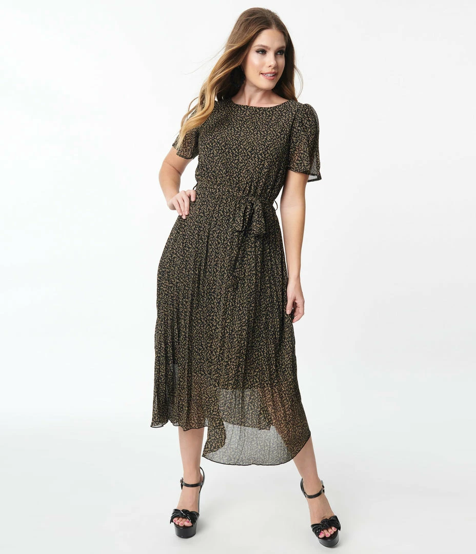 Falling leaves await, darling! A fabulous vintage style dress, this beautiful silhouette is crafted in black lightweight crepe that dances with a print of ditsy cream leaves throughout. The modest scoop neck is nipped in with a back button to create a keyhole effect, and framed with flutter sleeves. The pleated skirt drops from the elastic waist as the self tie sash cinches your feminine form and the attached lining provides all day comfort!
