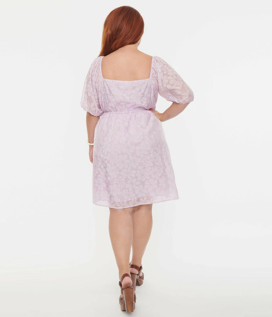 This sweet plus size babydoll dress is crafted in a lilac floral sheer chiffon that dances over a matching lining. The square neckline is framed by puff sleeves complete with elastic shoulders and cuffs.