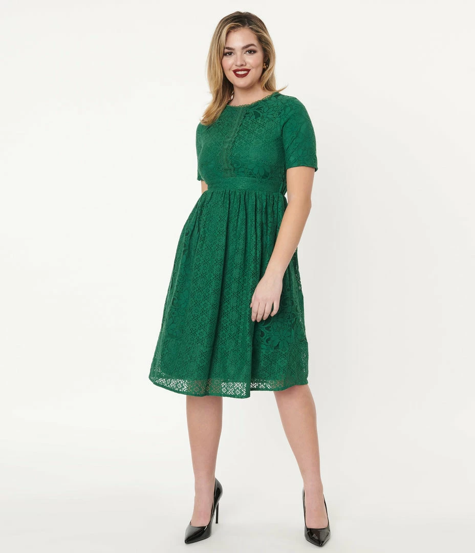 A gala in lace, darling! This divine frock is crafted in a fabulous green lace features a romantic mid-century silhouette in modest styling. The scoop neckline is framed by sweet short sleeves while the banded back elastic waist and back zipper provides a subtle cinch to your figure. The gathered skirt drops to your knees with a beautiful matching green lining!