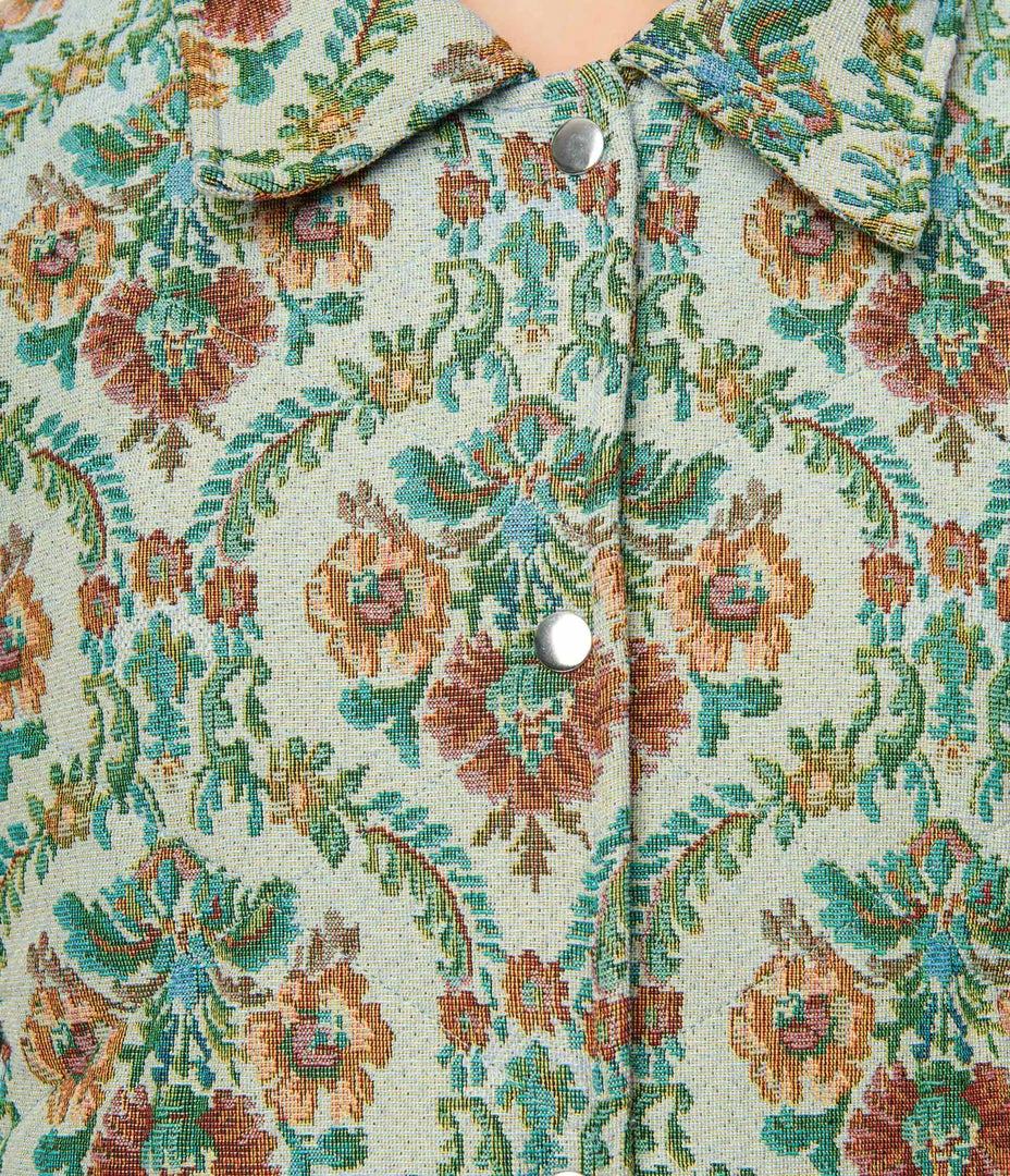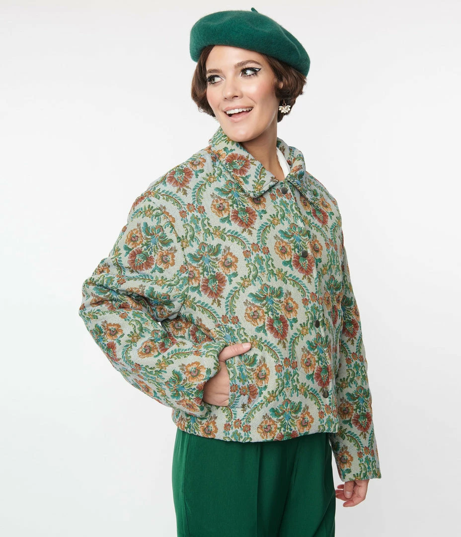 Make all your vintage dreams come true with this gorgeous jacquard jacket. Crafted in a beautiful green woven fabric featuring warm florals throughout. Complete with side pockets and a snap button up front leading to the sophisticated collared neckline.
