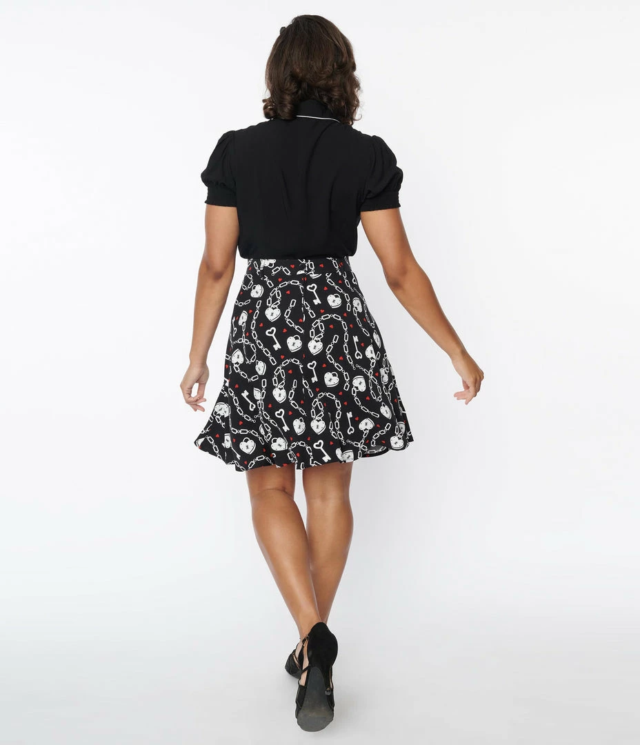 This sweet skirt from Hell Bunny is crafted in a lightweight woven crepe and boasts an all over print of white heart shaped locks and chains throughout the black backdrop. Complete with back zipper, and heart shaped patch pockets!
