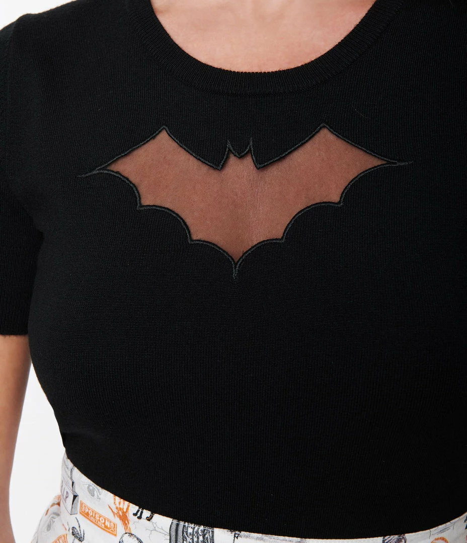 This sweet knit top from Hell Bunny is crafted in a black soft knit fabric that boasts a mesh bat shaped keyhole. Complete with scoop neck and short sleeves!