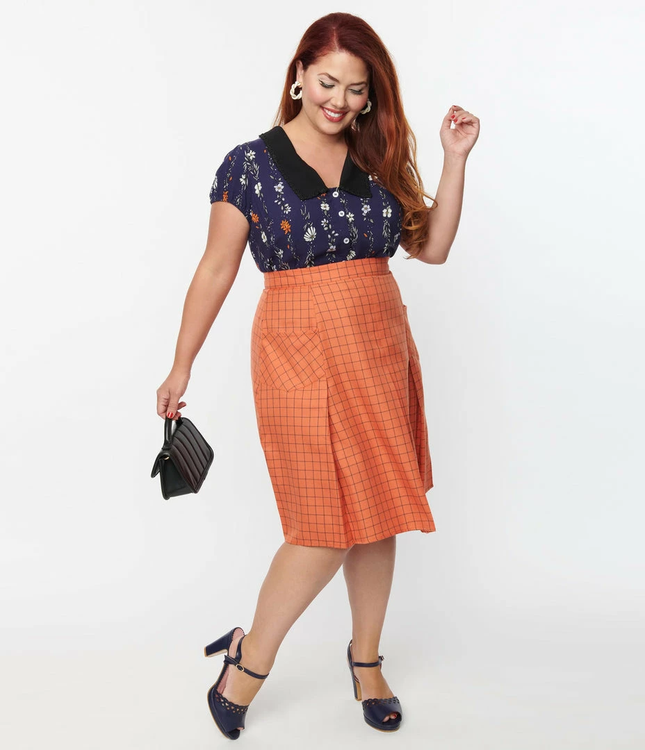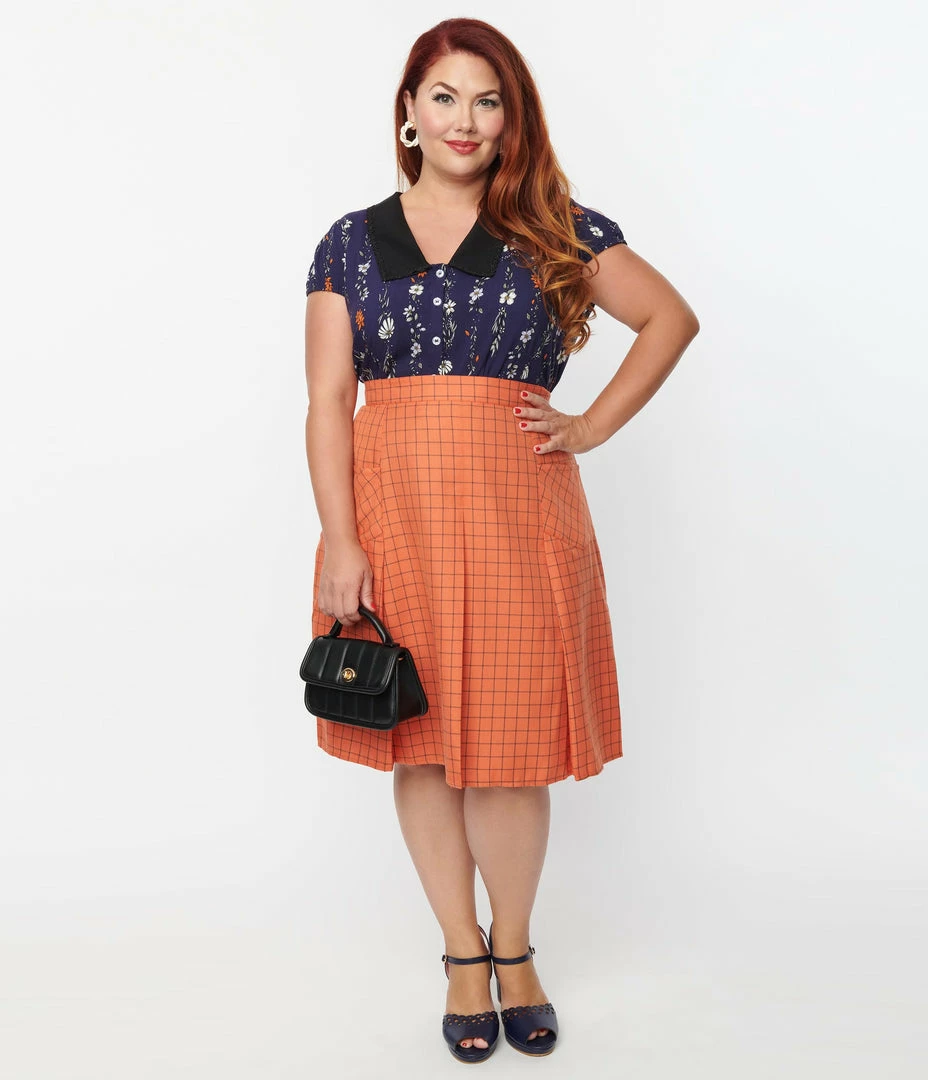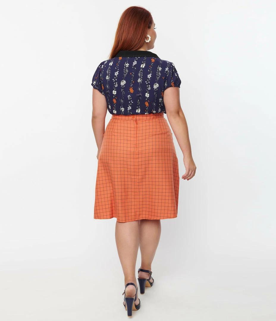 A classic plus size flare skirt, crafted in a brushed woven fabric that features a black windowpane gingham throughout an orange backdrop. Complete with a back zipper, front patch pockets, and sweet pleats.