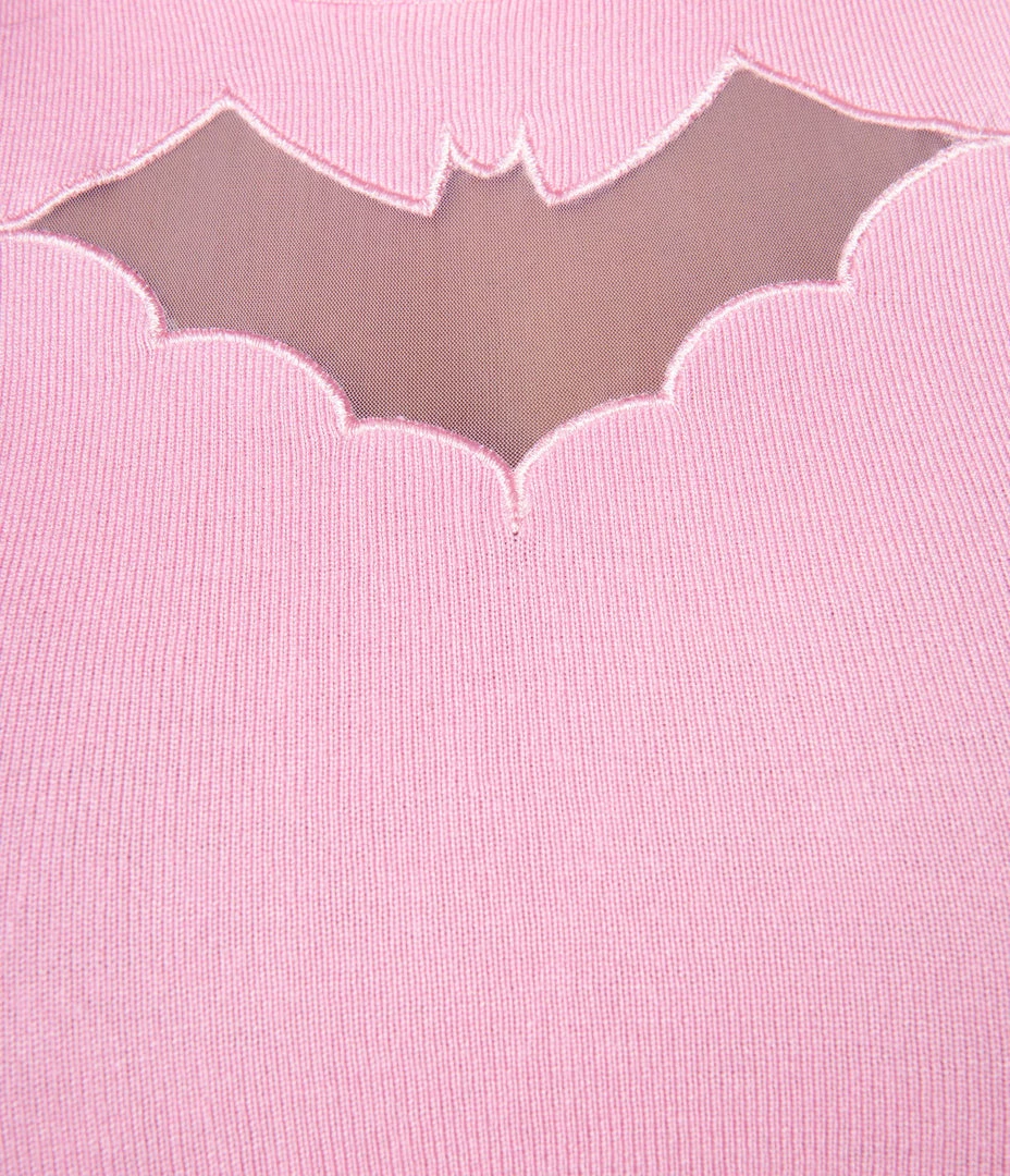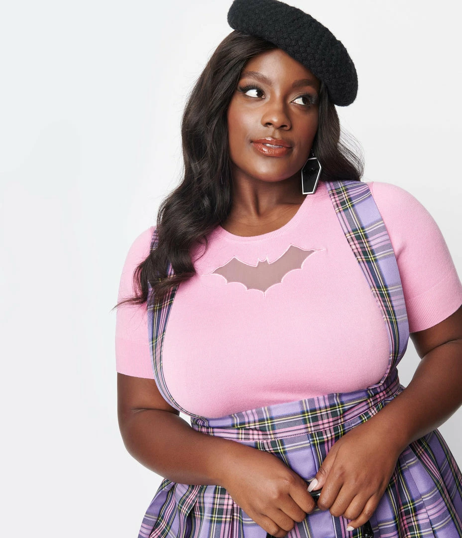 This sweet knit top from Hell Bunny is crafted in a light pink soft knit fabric that boasts a mesh bat shaped keyhole. Complete with scoop neck and short sleeves!