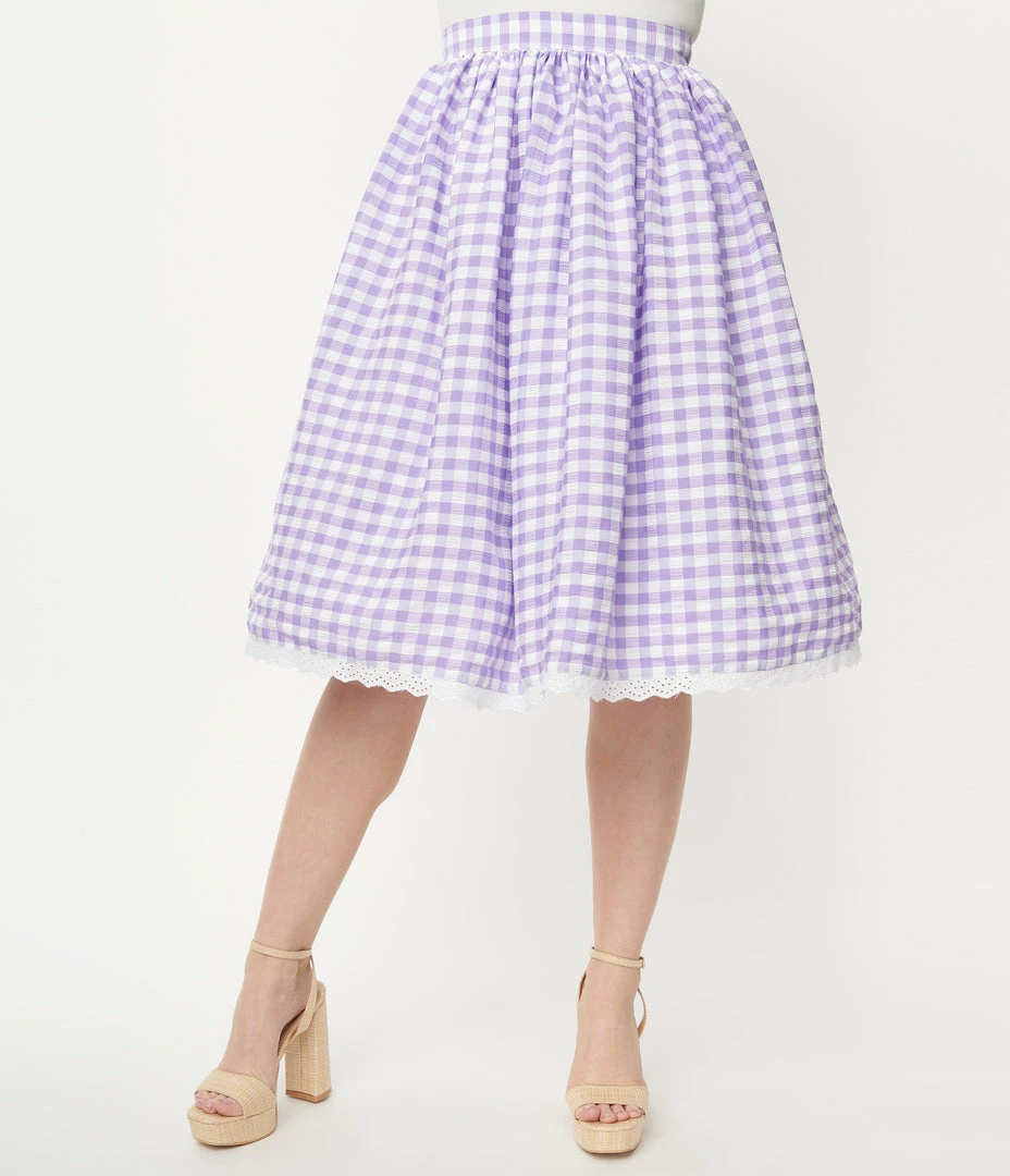 Picnic perfection! A vintage inspired swing skirt from Hell Bunny, this charming separate is crafted in a sweet seersucker fabric boasting a purple and white gingham throughout. The banded high waist is nipped in with a back zipper for a flattering retro silhouette, while the swing skirt drops to your knees and is outfitted with side pockets!