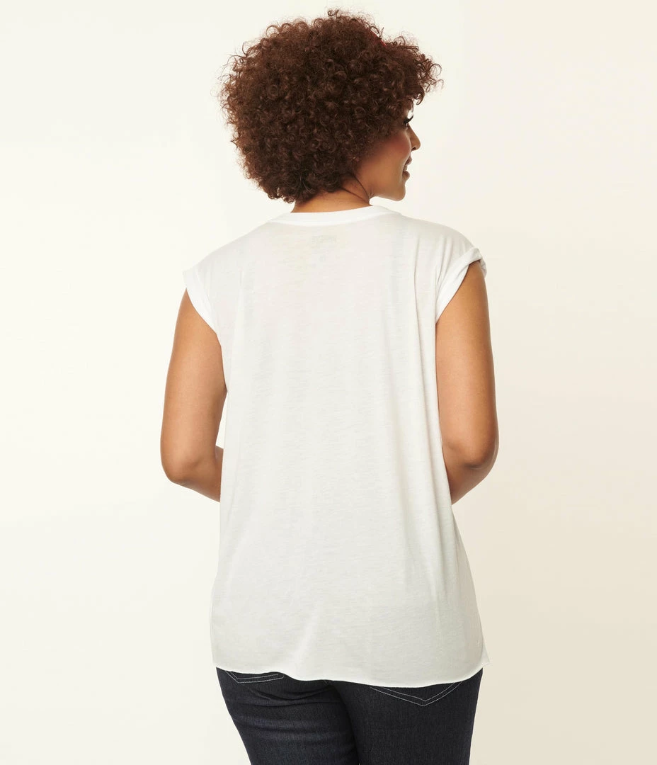 This unisex graphic tee is cast is a soft white cotton knit boasting a print of Olive Oyl giving Popeye a kiss with the font โLove, Loveโ. Complete with crew neck, cap sleeves, and high-low raw edge hemline.