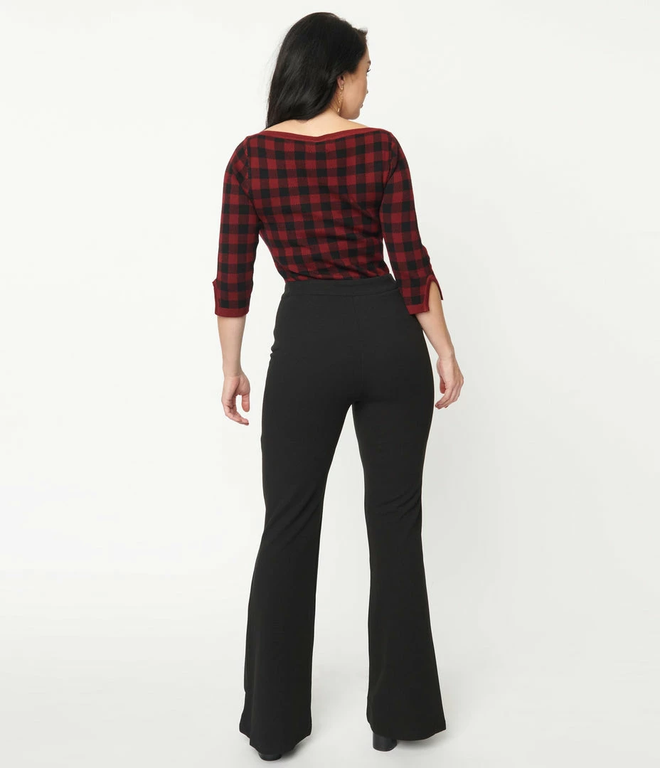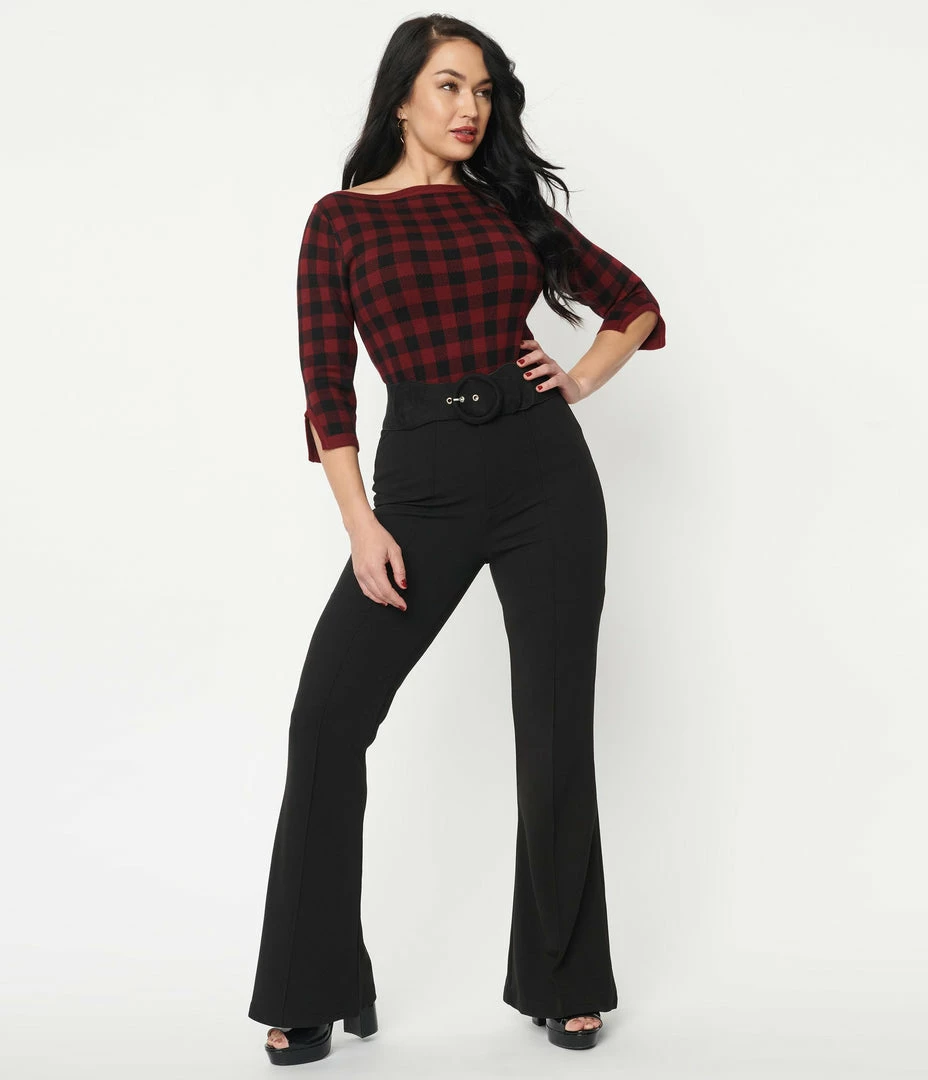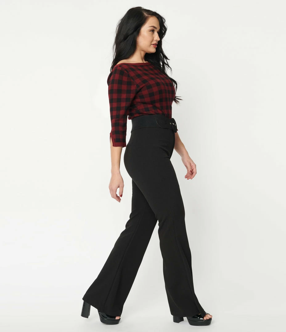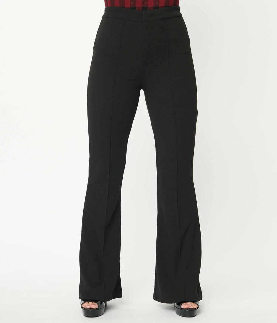 Stylish slacks to covet, ladies! These retro style pants are crafted in a black woven blend and boast a fabulous high waist silhouette. The subtle flare legs are accented with front pleated seam detailing that elongates your legs, while the waist is cinched with a classic front zipper and hook!