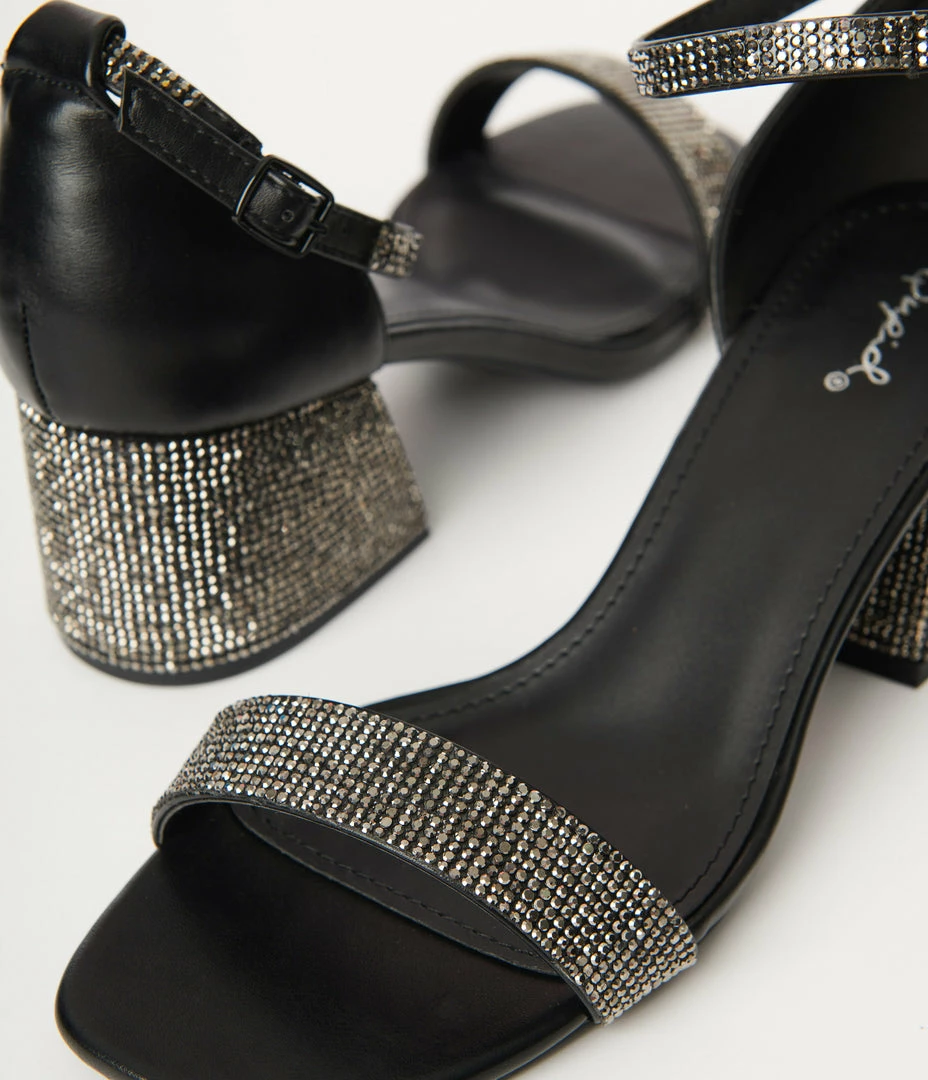 These feminine heels are crafted in black leatherette and sparkle with rhinestones throughout the single strap vamp, 2.5 inch block heel, and the adjustable ankle strap.