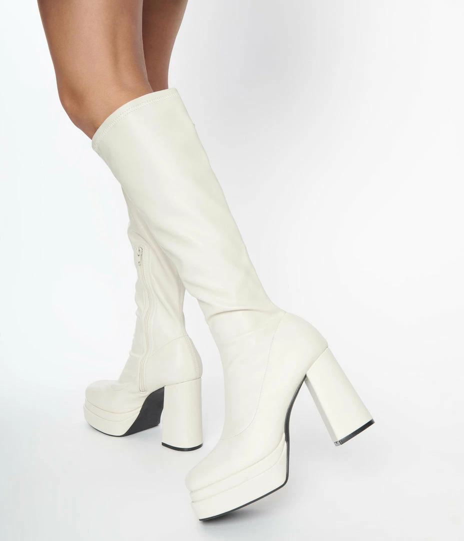Bring your mod vibe to a new level with these iconic Gogo Boots, crafted in white leatherette, boasting a dramatic 1.5 inch platform and 4.75 inch block heel!