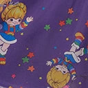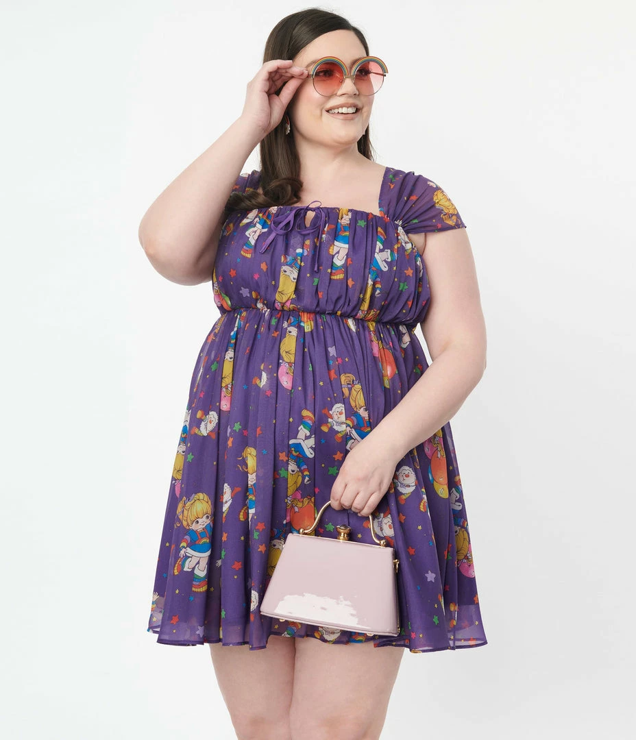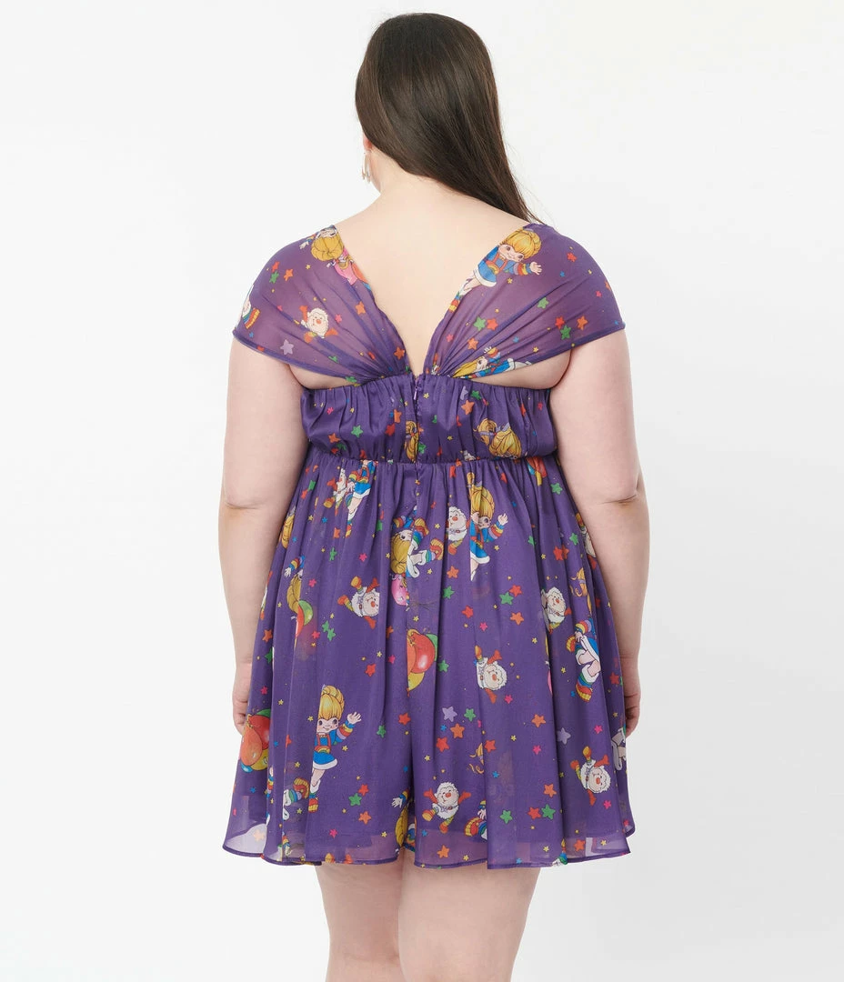 This sweet plus size babydoll dress, in collaboration with Rainbow Brite, is crafted in a lightweight purple chiffon-like fabric that dances with Rainbow Brite and Twink throughout multicolor stars. Complete with a self tie keyhole, a back zipper, lining, and side pockets.