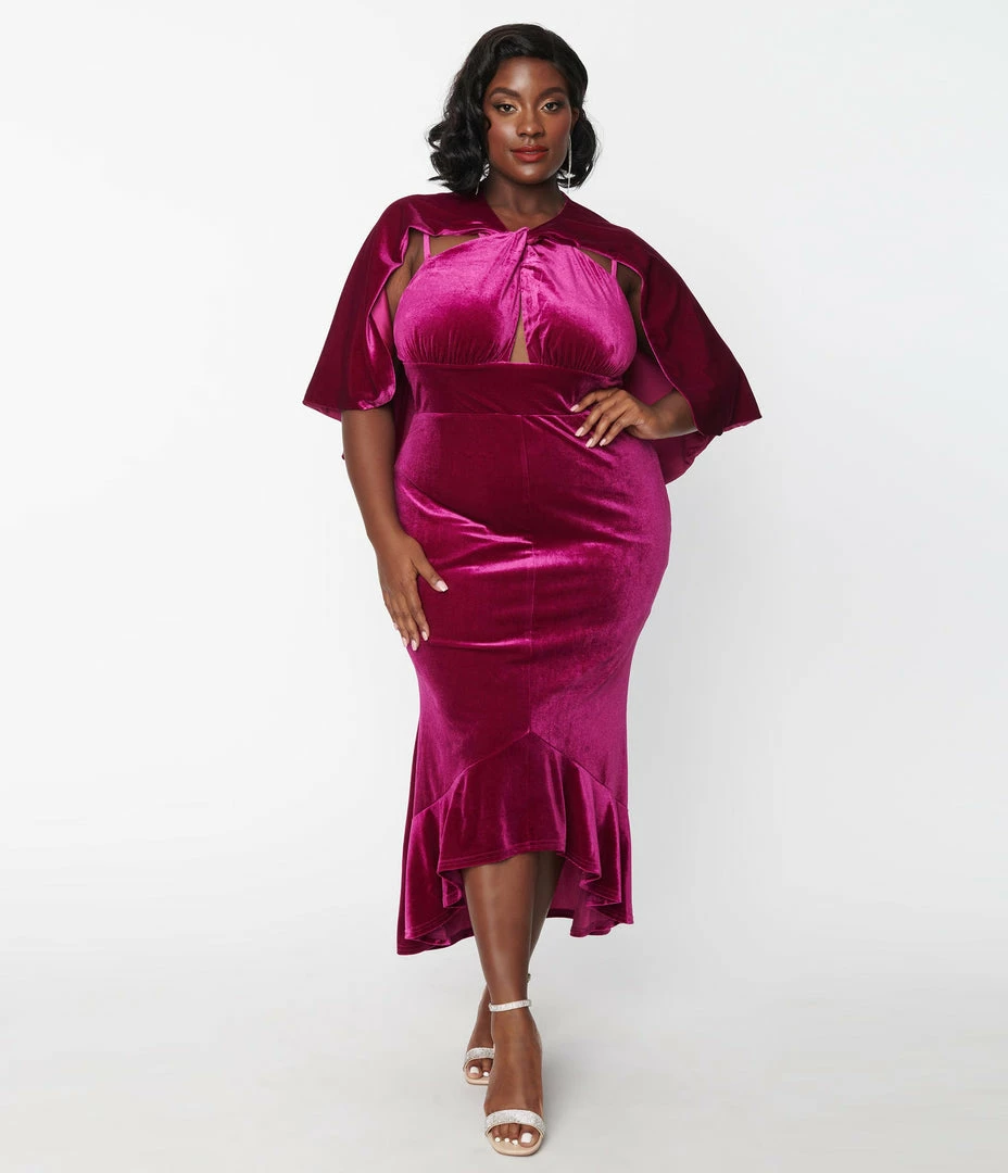 Old Hollywood with a modern twist, this stunning dress is crafted in a fuchsia velvet that’ll hug your curves in all the right ways. Show off the perfect amount of cleavage with a slight front opening that goes up into a twist tie neckline that leads to a classic 1940s style satin lined cape as it adorns your shoulders. This dress is guaranteed to turn heads finished with its fishtail hem.