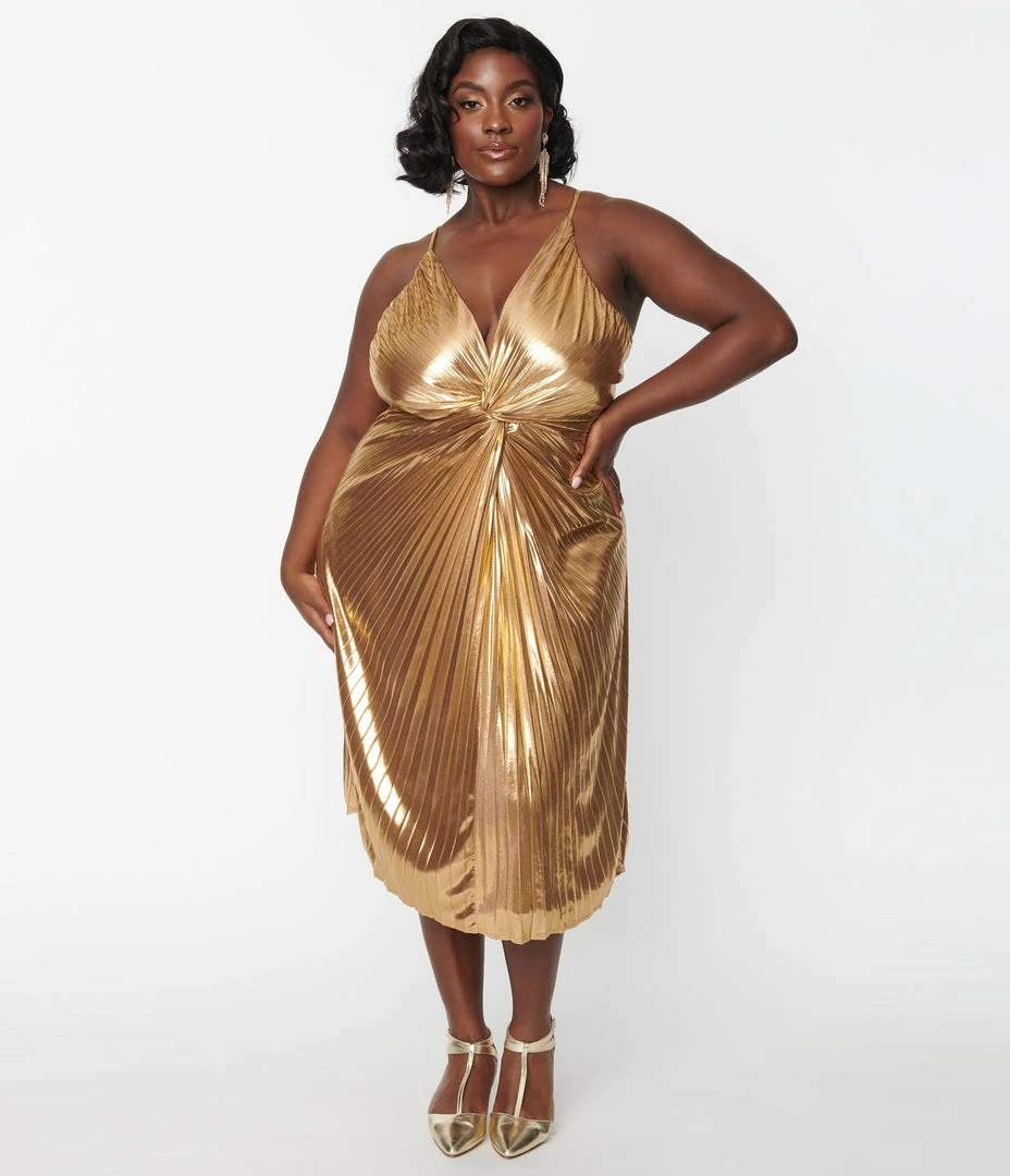Step into the limelight of Old Hollywood with the Golden Age dress. Inspired by Marilyn herself, this stunning lame dress was crafted in a gold pleated fabric coming together into a plunge twist neckline. Complete with a back zipper and adjustable straps.