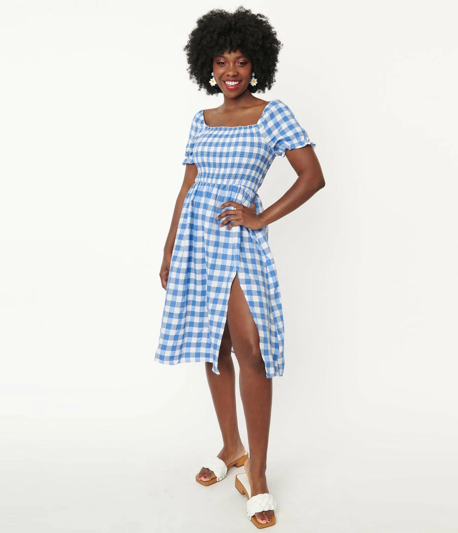 Simply fabulous, dears! This charming dress is cast in a blue and white gingham crepe. The smocked bodice is framed by the off the shoulder silhouette complete with short puff sleeves secured with elastic cuffs.The gathered midi length skirt drops from the seamed waist and boasts a sultry side slit to show off your gams!