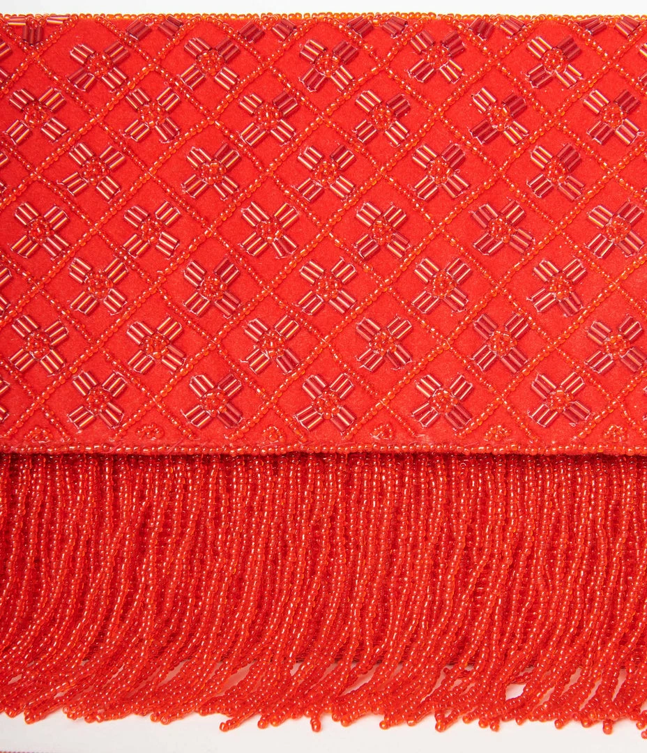 This beautiful envelope clutch is covered with dazzling red beads and fringe, set in a soft faux suede. This gorgeous accessory opens by a magnetic closure into a soft interior with an inner slip pocket.