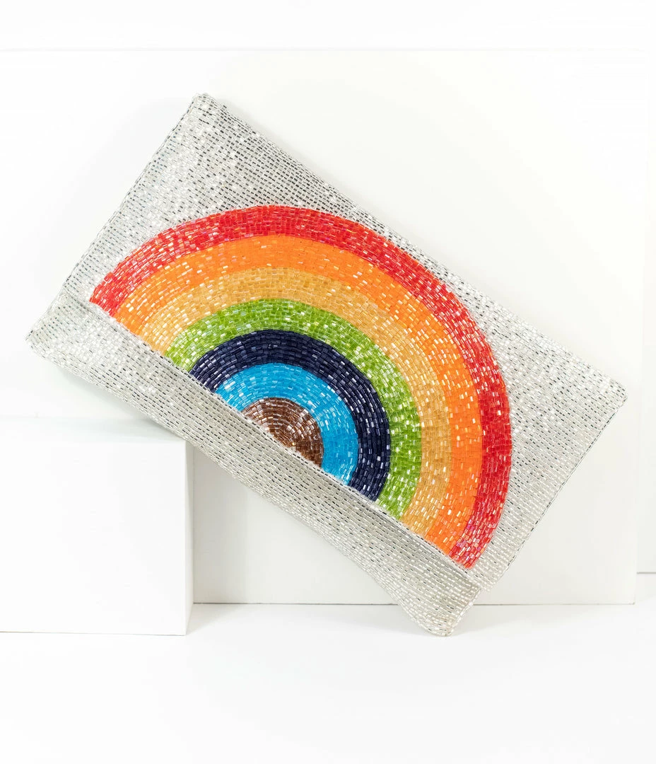 Here’s the love at the end of the rainbow, dolls! This glittering clutch features a beautiful array of silver beading throughout while a stunning multicolor rainbow sits on front. The dual magnetic fold over opens to a gleaming fabric interior, complete with an inner slip pocket. A removable silver chain allows for versatile wear.