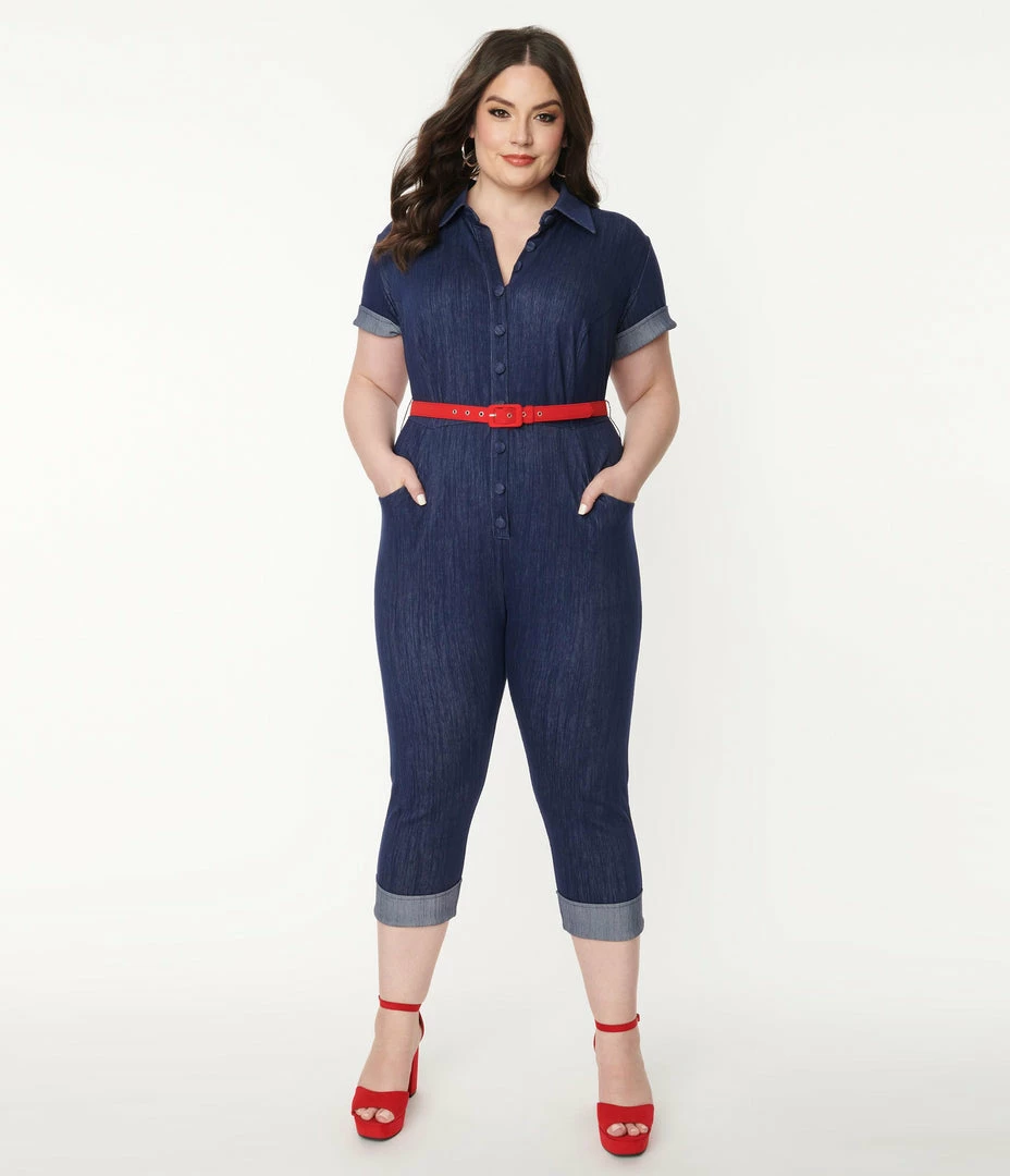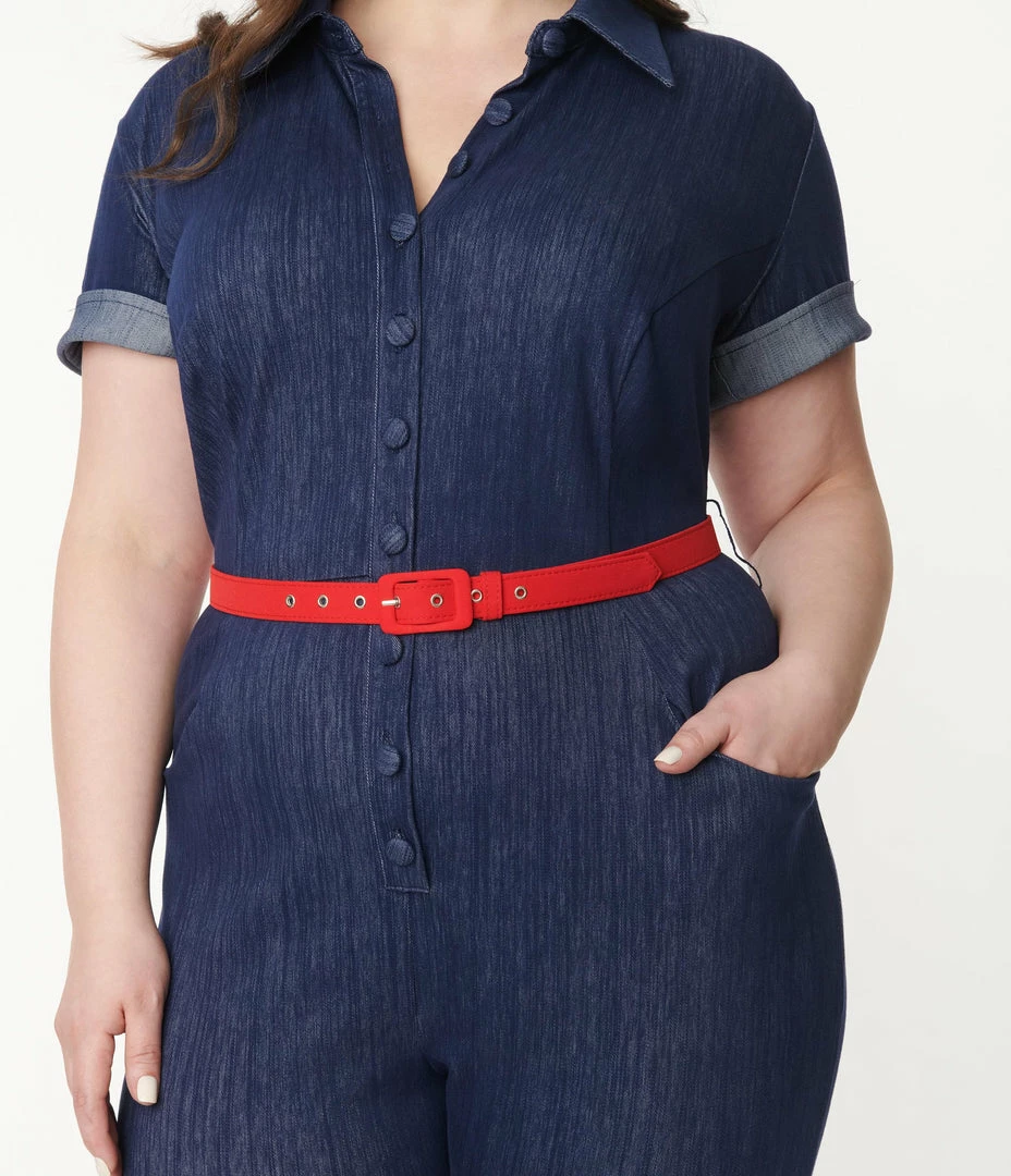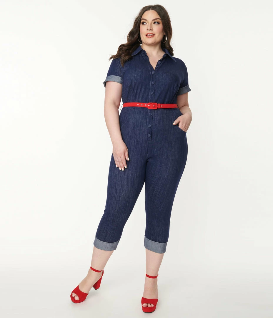 This stunning plus size jumpsuit is crafted in a denim blue stretch blend. Complete with a button up front, a red belt, and fitted cropped legs, outfitted with side and back pockets.