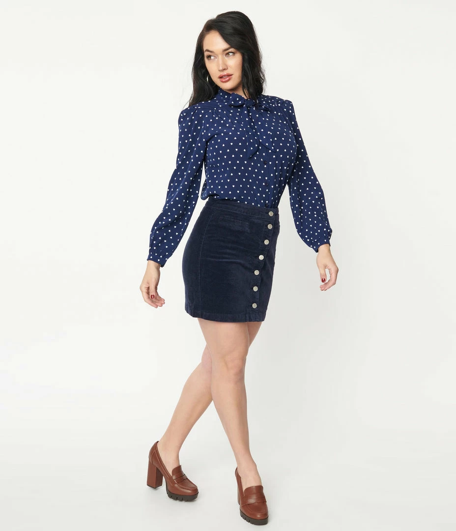 Play on their heartstrings, dames! This flirtatious mini skirt is crafted in a fabulous navy blue corduroy that secures with a button up front while faux pockets add a dash of retro accent. The banded waistline nips in your figure for a unique and flawless fit, giving you an adorable retro silhouette!