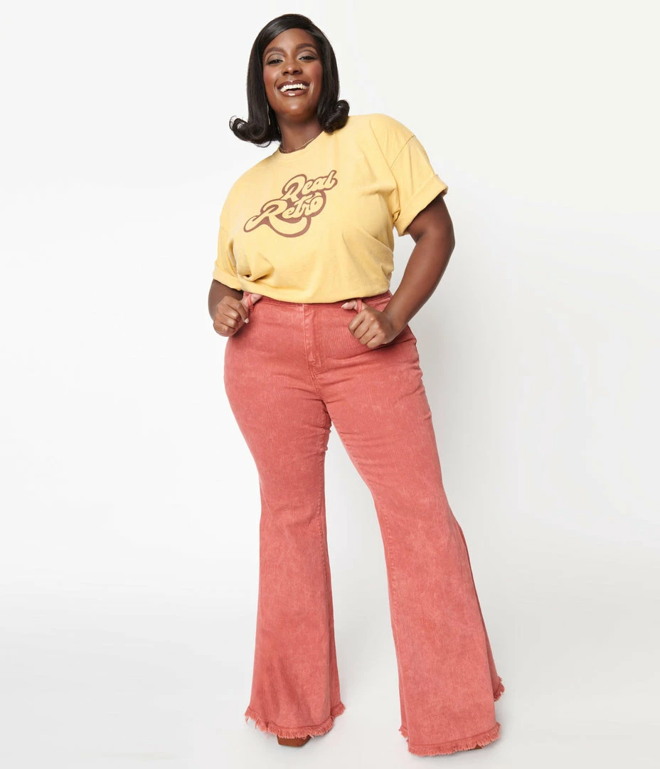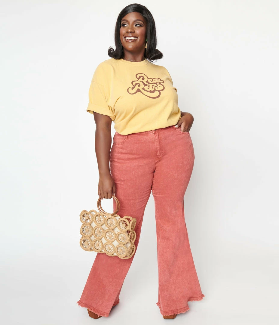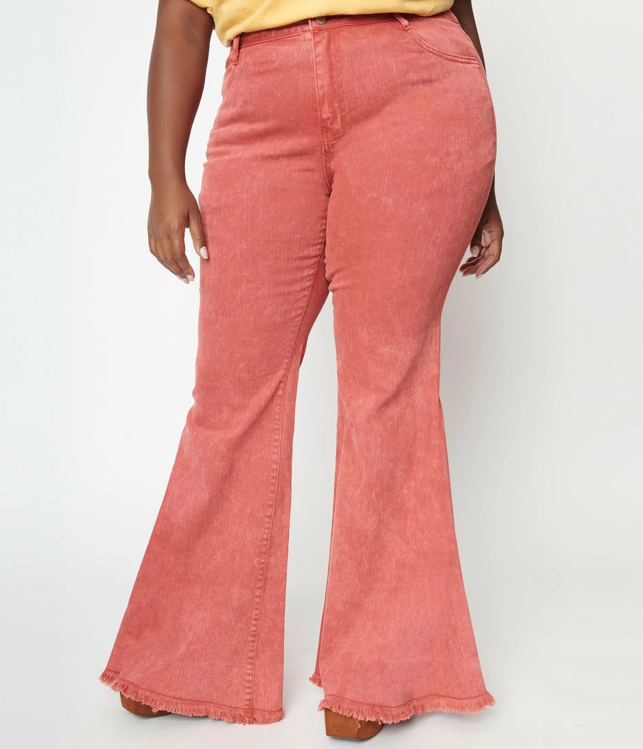 These plus size wavy separates feature a groovy bell bottoms flare with distressed hem crafted in a marvelous rust red cotton. Complete with classic front fly, and front and back pockets!