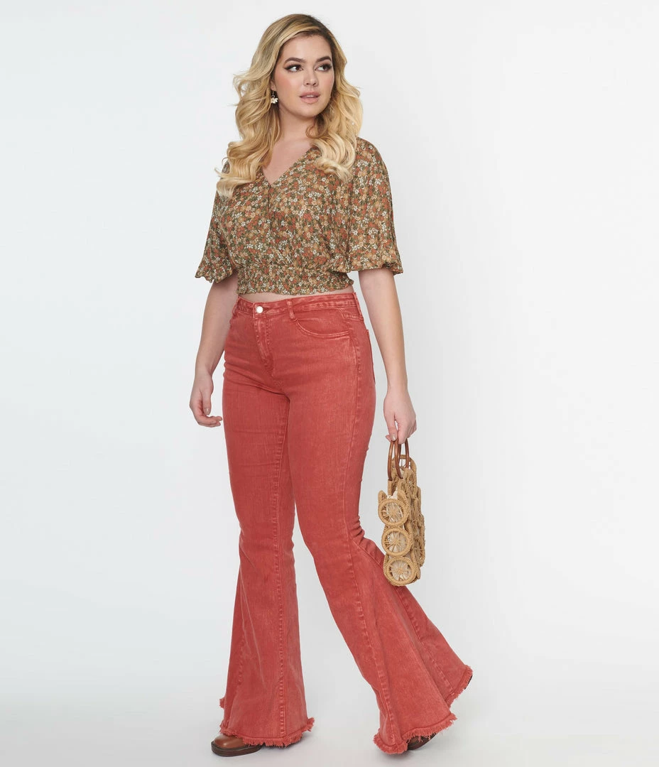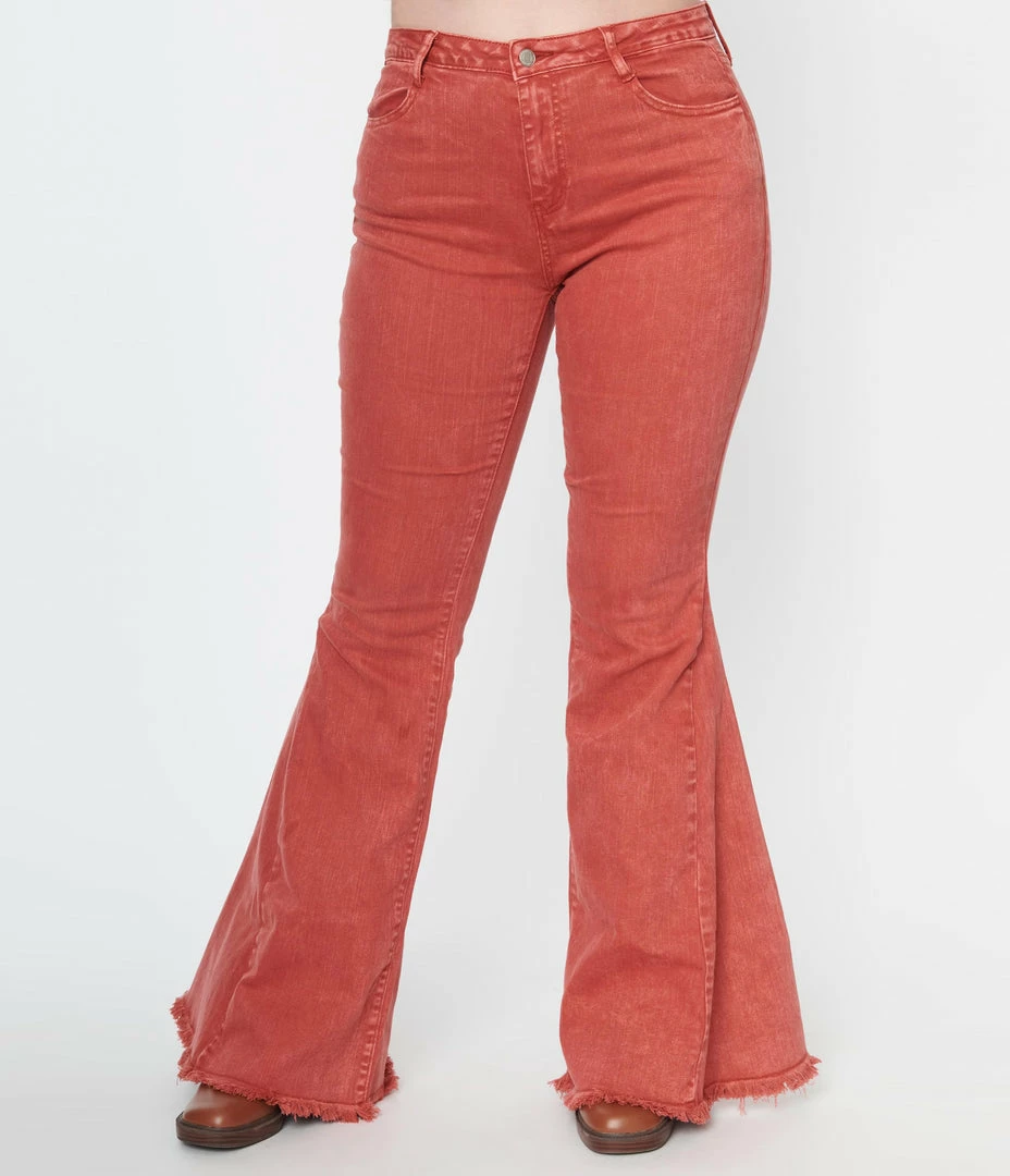 These wavy separates feature a groovy bell bottoms flare with distressed hem crafted in a marvelous rust red cotton. Complete with classic front fly, and front and back pockets!