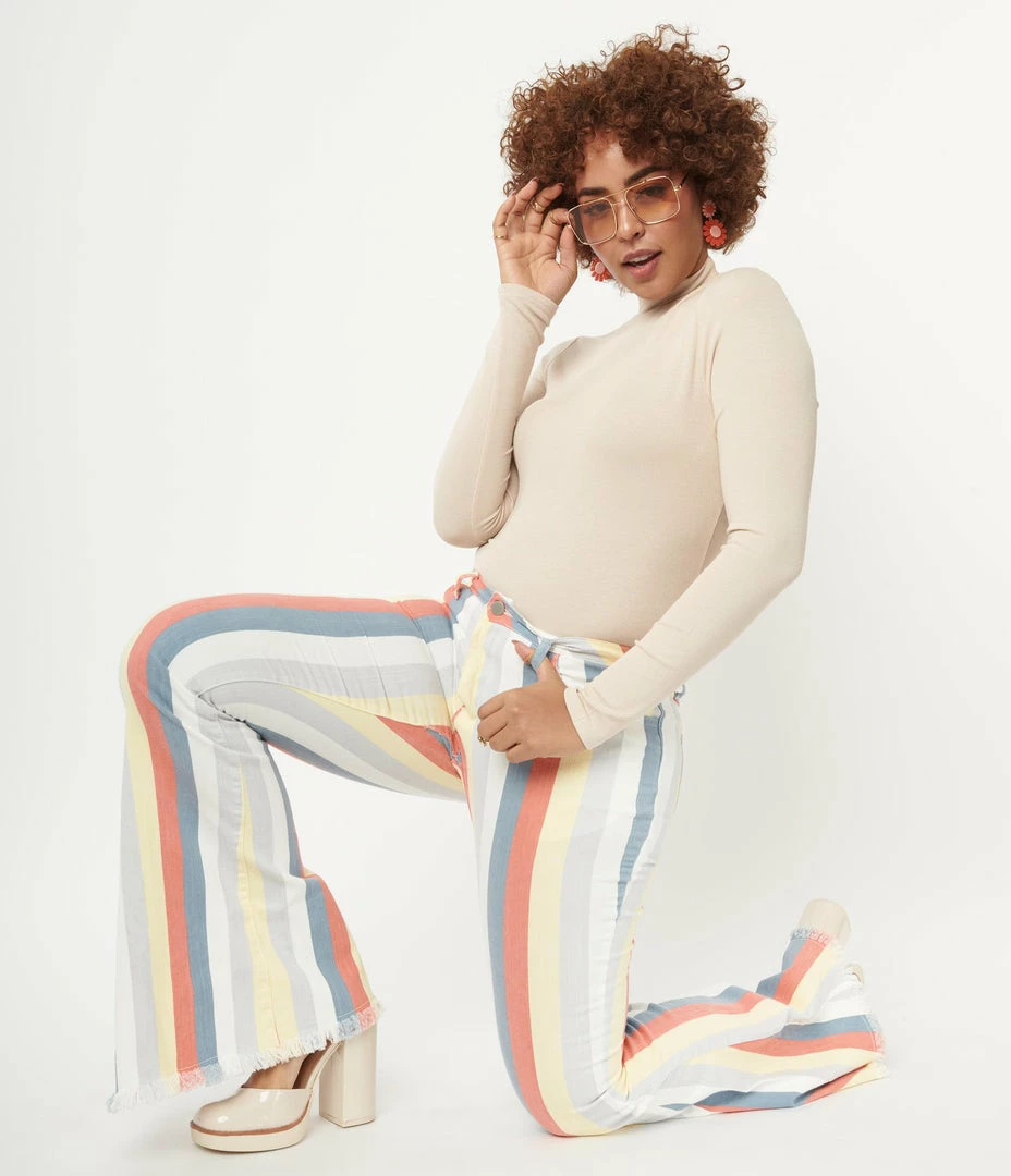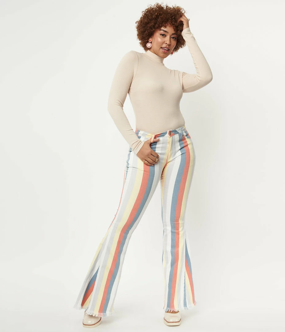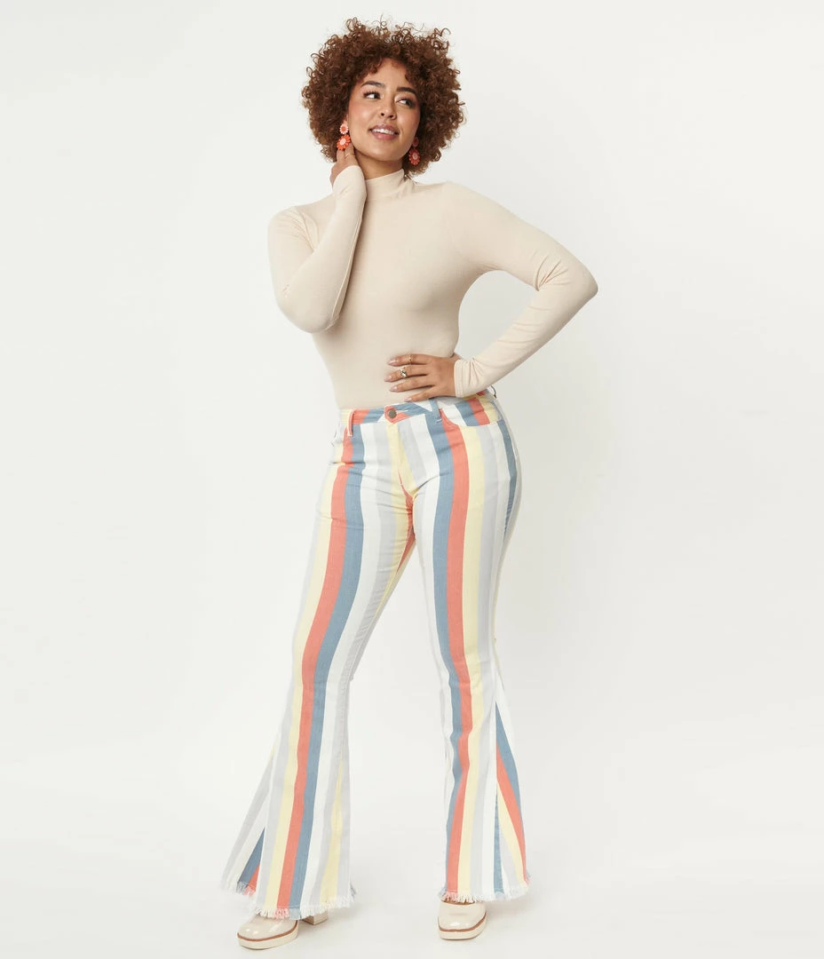 Command their attention, dolls! A striking pair of pants for your vintage wardrobe, these separates feature a stunning multicolor striped pattern in terracotta orange, blue, grey, and white throughout a groovy bell bottom flare, complete with a distressed hem, crafted in a marvelous cotton denim stretch. The banded high waist boasts belt loops for your favorite cincher while side and back pockets lend function. Nipped in with a classic front fly, itโs a check off your list!