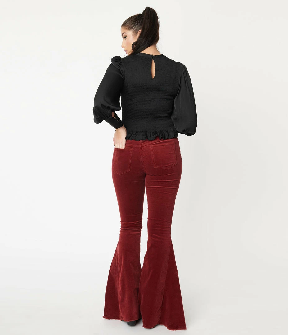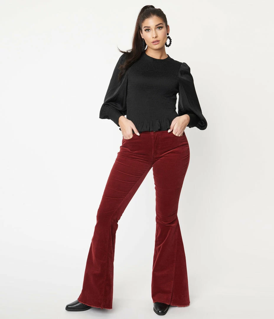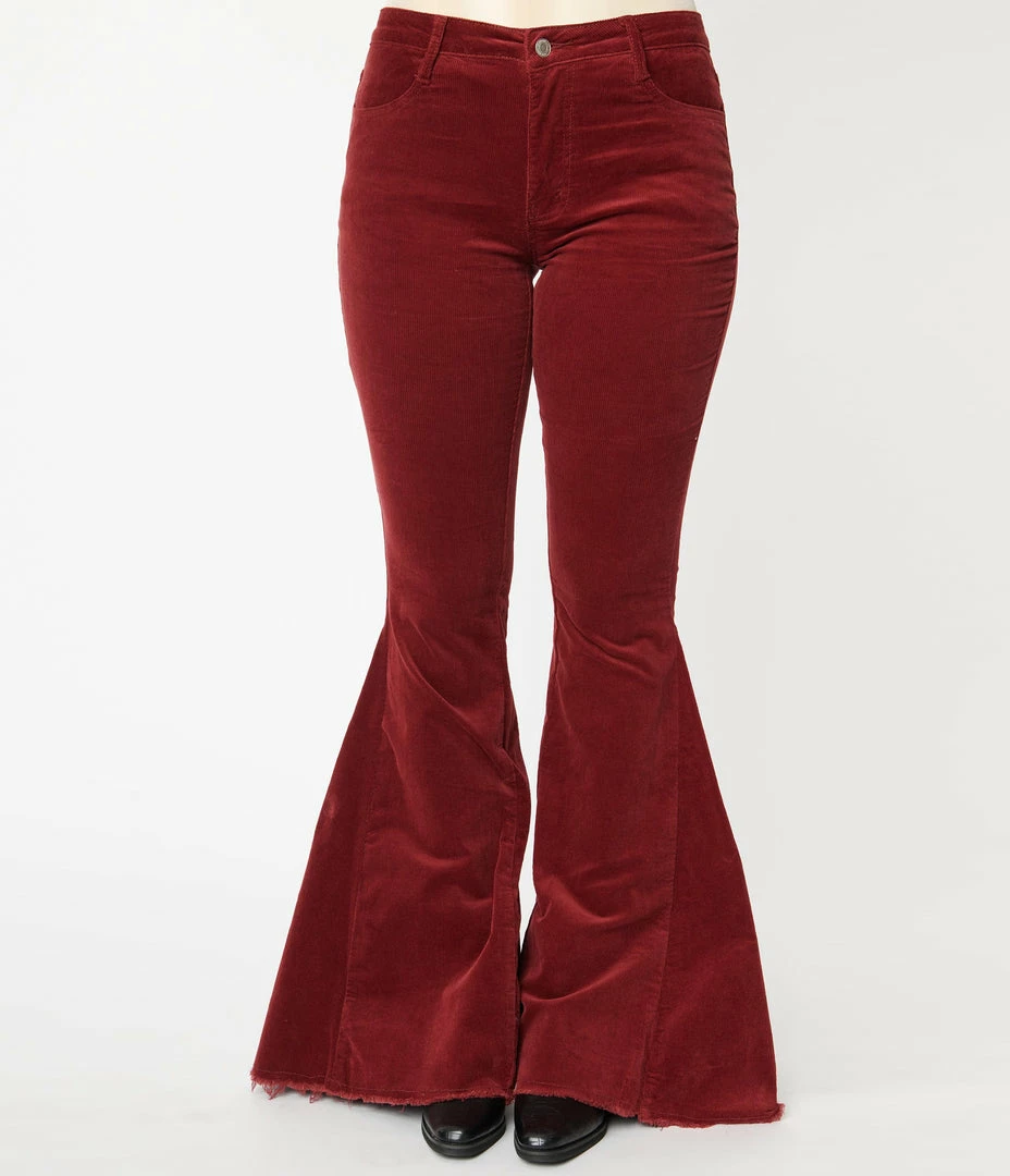 Retro rockabilly, dolls! A classic pair of corduroys for your vintage wardrobe, these fantastic separates features a groovy bell bottoms flare with distressed hem in wine red, crafted in a marvelous cotton. The banded high waist boasts belt loops for your favorite belt while back and side pockets lend modern function. Nipped in with a classic front fly, it’s a check off your list!