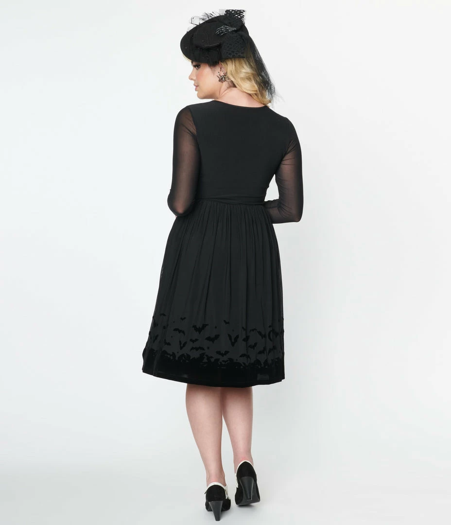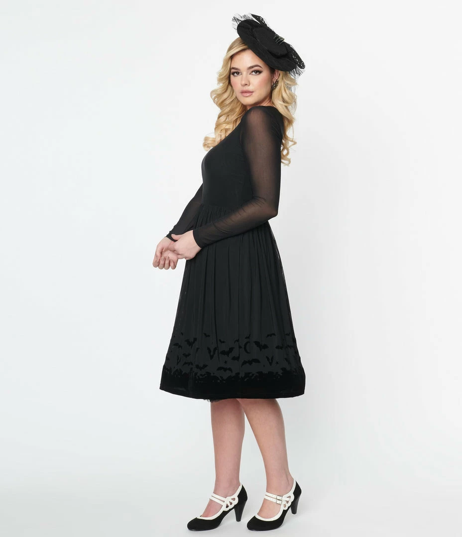 This spooky swing dress from Collectif is crafted in a fabulous black sheer mesh that dances over a matching lining, and features flocked velvet bats along the knee length border!
