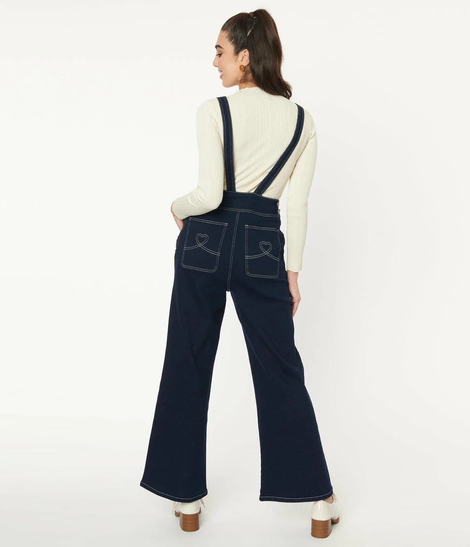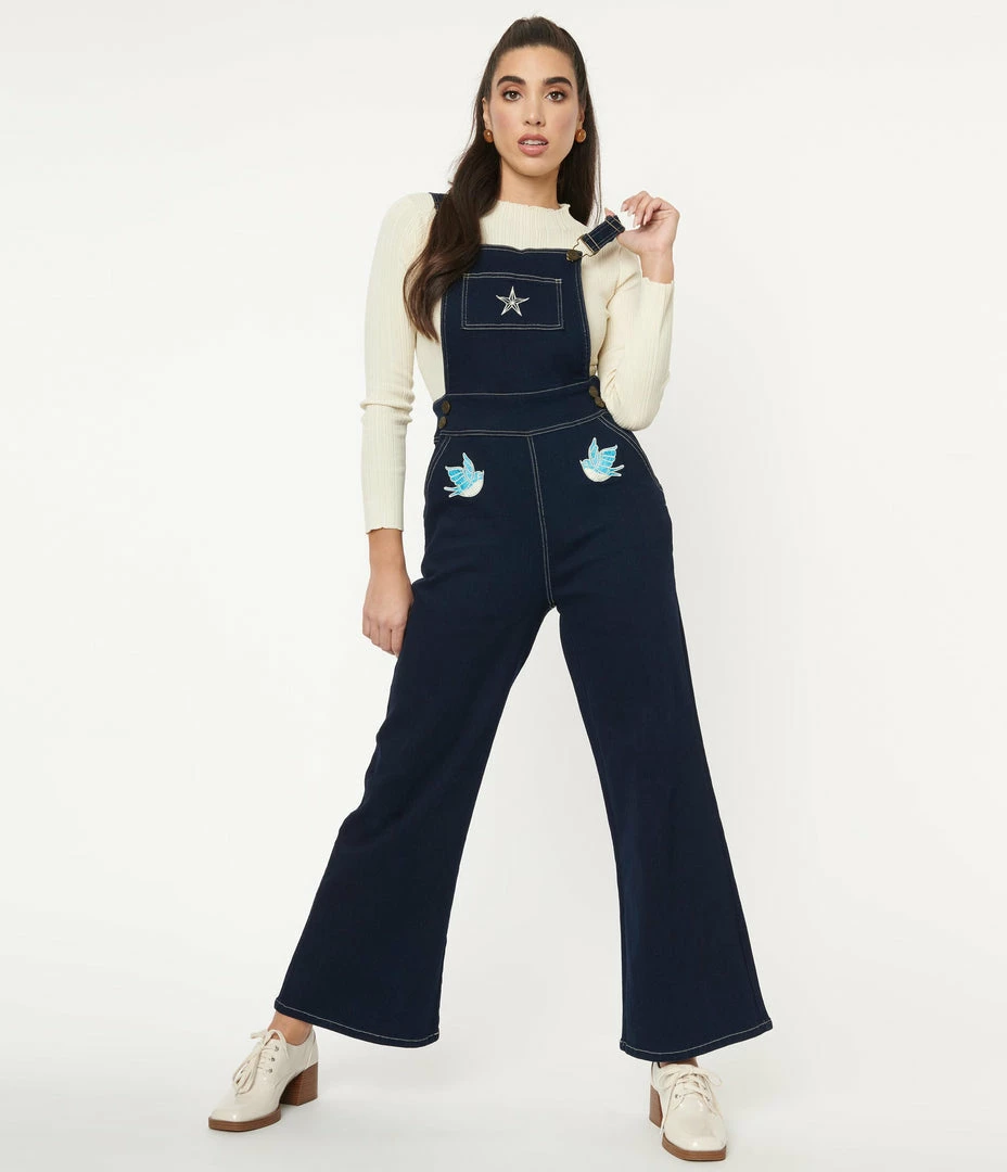 A little birdy told us that you would love these! Full of tattoo flash and vintage style, the Renata Overalls from Collectif are full of retro inspiration, and crafted in a dark wash stretch cotton denim. The classic square bib is secured with adjustable fascinators and boasts a pocket embroidered with a nautical star. The wide leg pants flare out from the banded waist that is cinched with a side zipper, for a flattering fit. The front pockets are accented with swallow embroidery patches, while the back pockets are accented with swirl hearts!