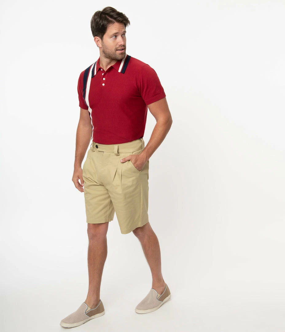 Make way for the casual khaki! A rapturously retro inspired pair of mens shorts from Collectif in a beautiful khaki tan, crafted in fabulous cotton blend. Boasting a button up front with a unique button tab while side pockets provide versatile function. Complete with belt loops for a dapper accent!