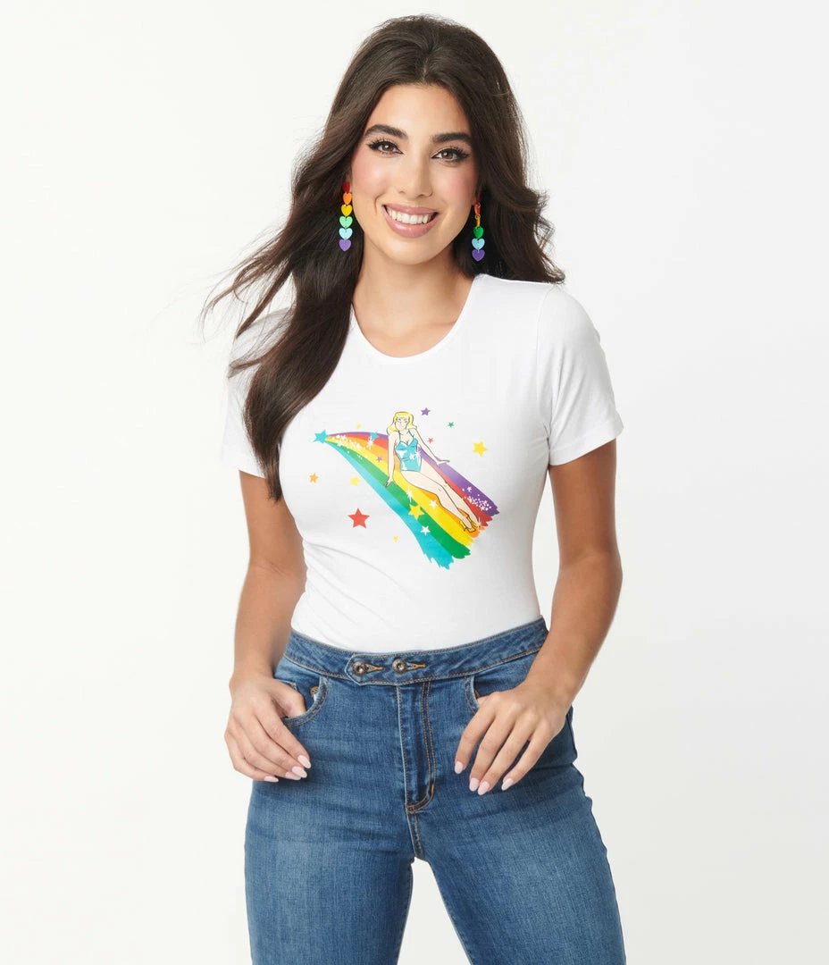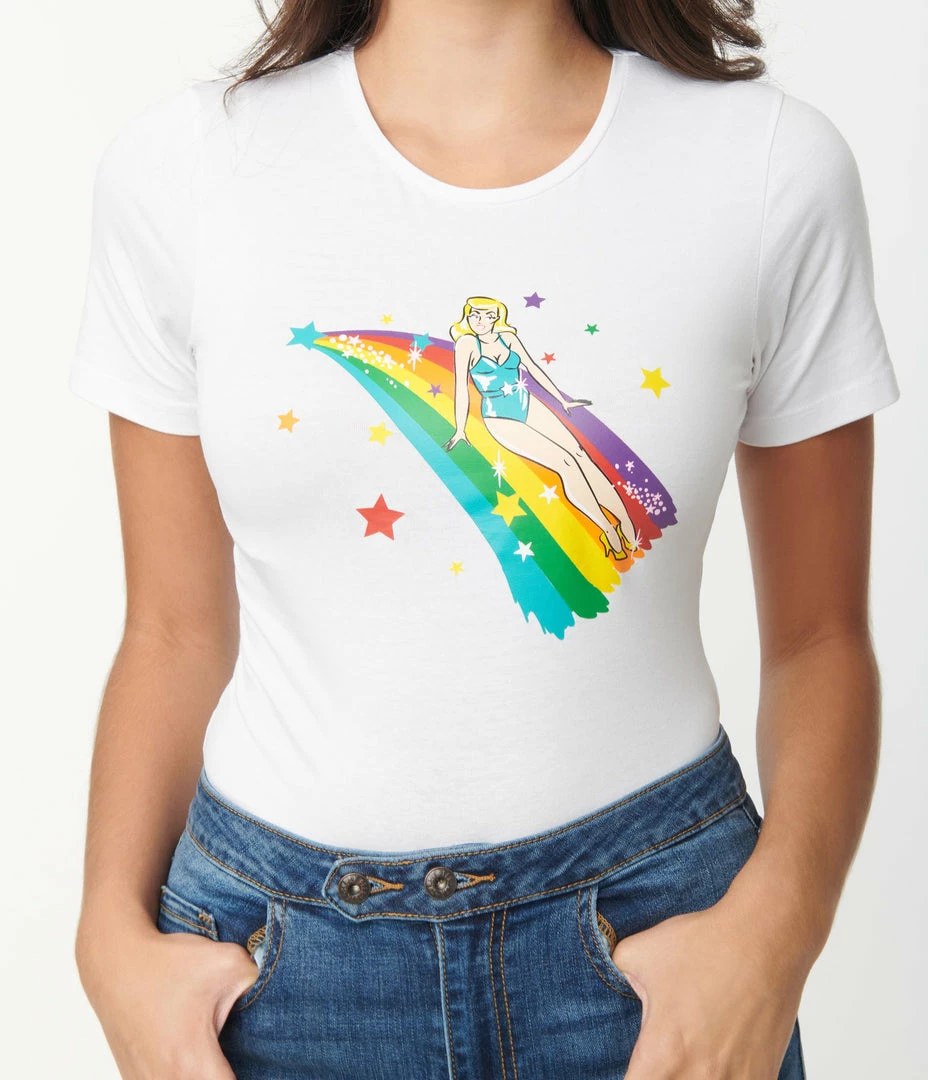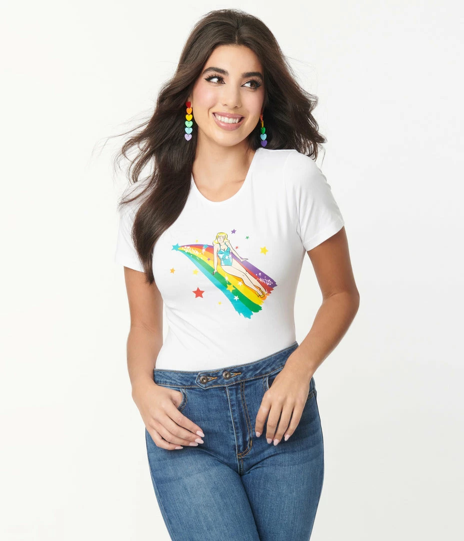 Letโs slide into the weekend, dolls! This adorable fitted graphic tee from Collectif is crafted in a white stretch cotton blend and features a graphic screen print of a pin-up woman in a bathing suit sliding down a rainbow. Complete with scoop neck and short sleeves!