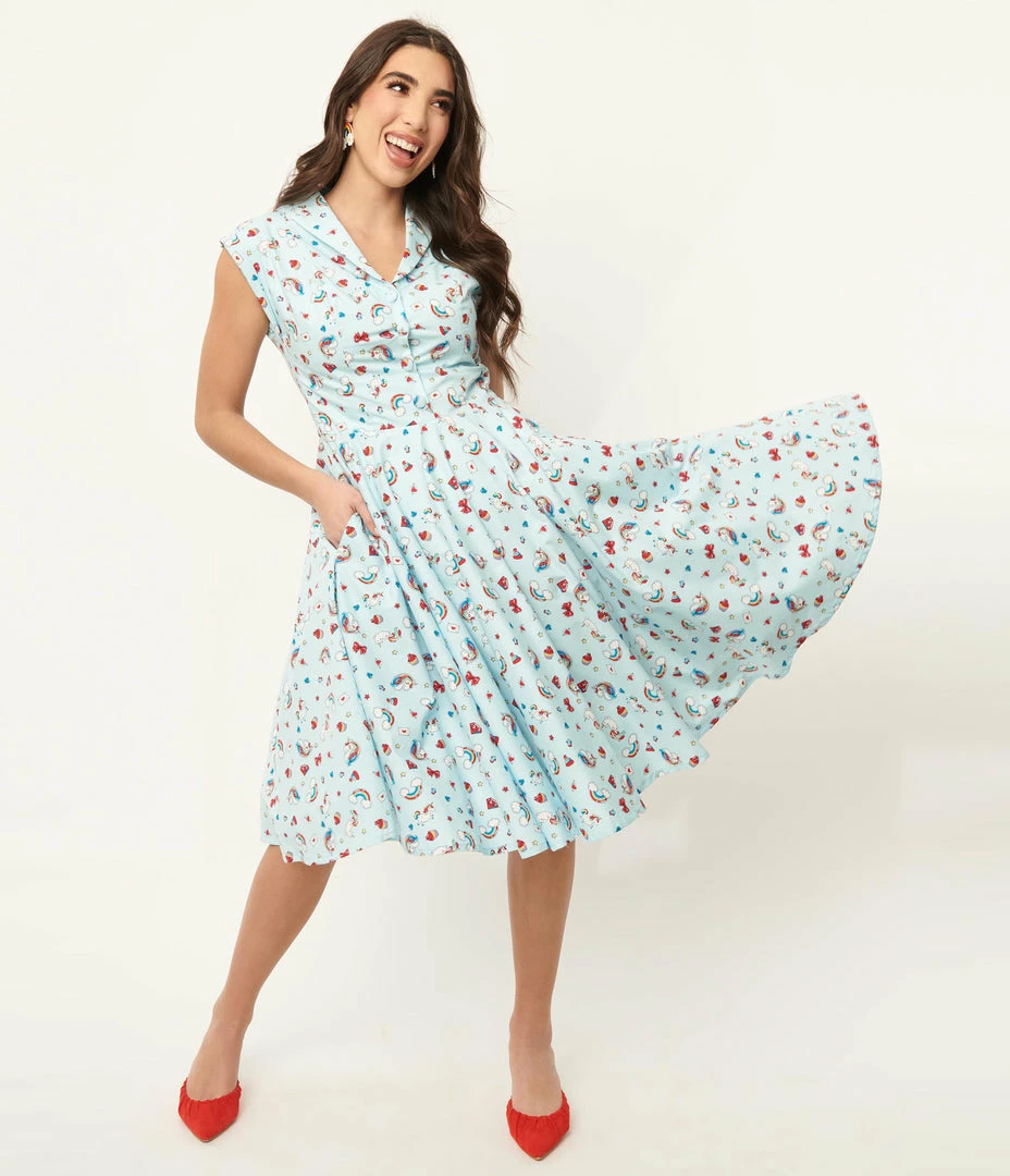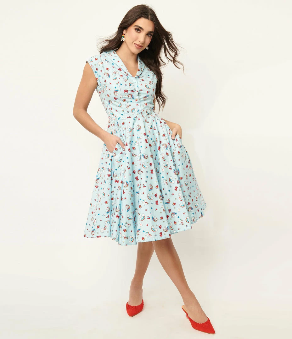 This sweet swing dress is crafted in a marvelous cotton and boasts an adorable print of unicorns, rainbows, hearts, gemstones, and stars throughout the light blue backdrop. The button up front of the princess seamed top leads to a classic lapel V-neck, framed by charming cap sleeves. The seamed waist is cinched with a side zipper while the swing skirt is outfitted with side pockets for modern function!