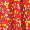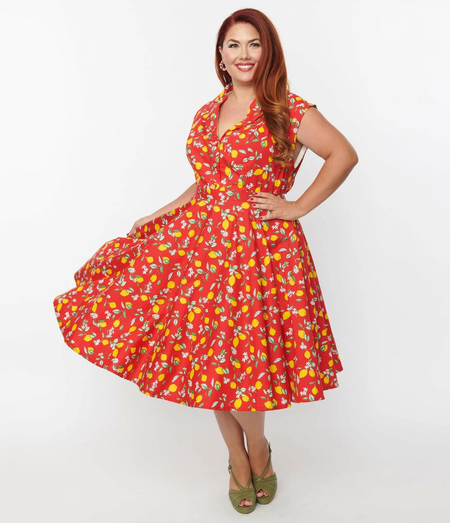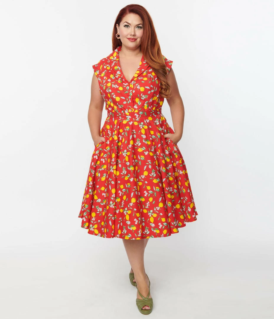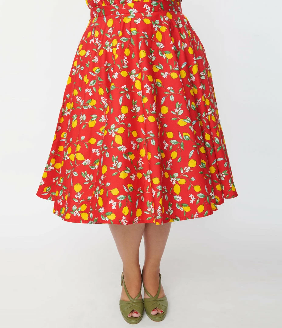 This sweet plus size swing skirt is crafted in a lightweight cotton that dances with yellow lemons cascading through a red backdrop. The banded waist is cinched with a back zipper and button and complete with side pockets.