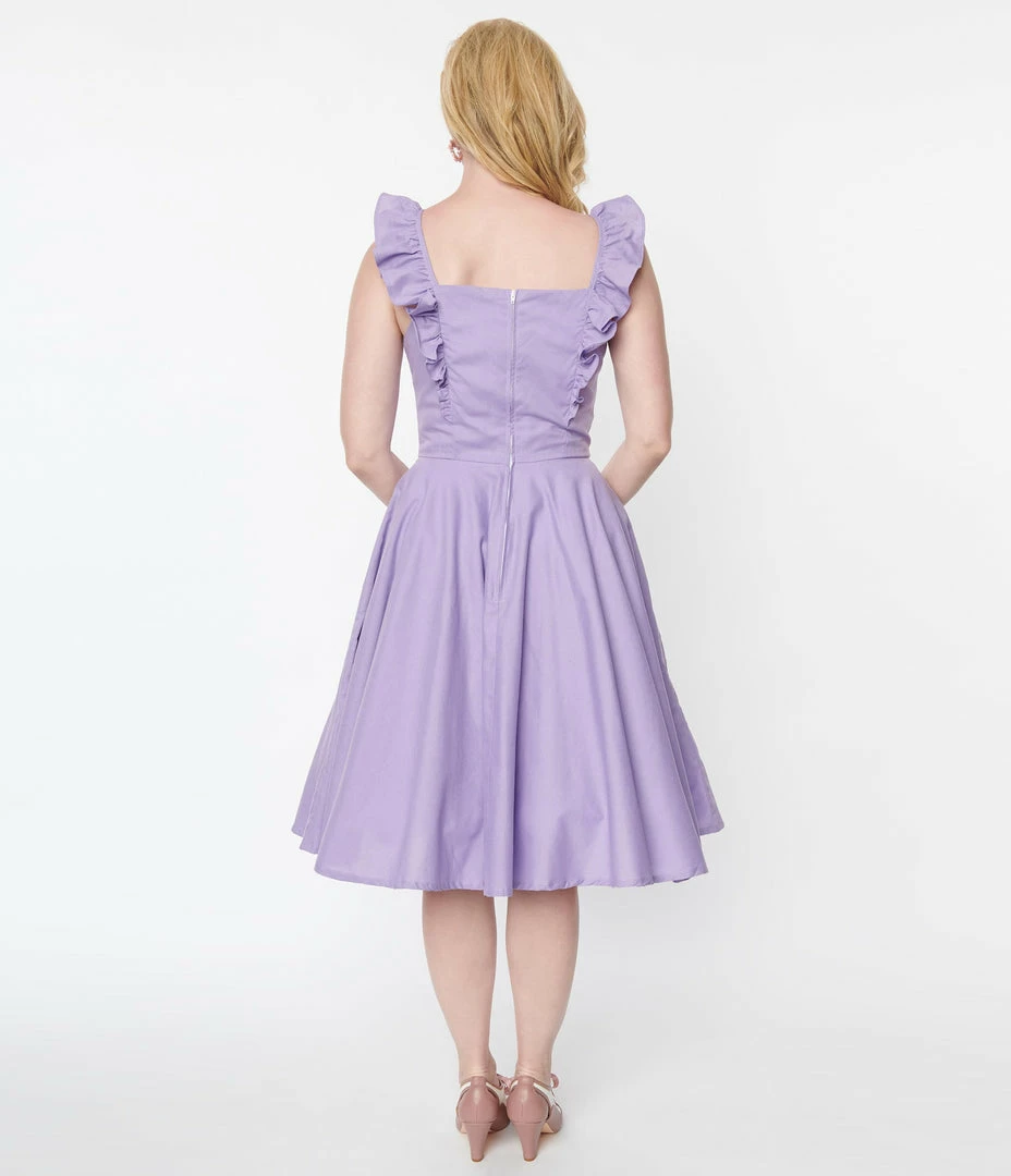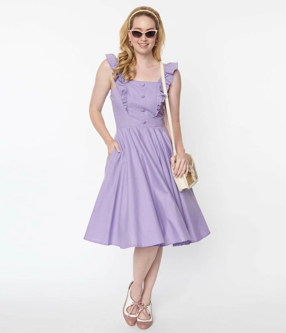 This sweet swing dress is crafted in a gorgeous lightweight purple cotton. The bodice boasts faux buttons framed by charming ruffle accent sleeves, while the swing skirt features side pockets. Complete with a back zipper!