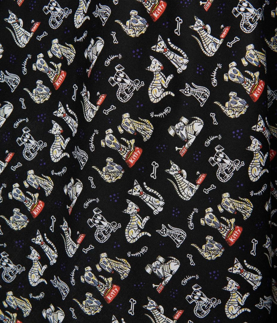 This frighteningly adorable skater dress is crafted in cotton and features a bevy of spooky skeleton cats and dogs throughout the black backdrop. The modest scoop neckline and princess seamed bodice are framed by a sleeveless design. Complete with back zipper and side pockets!