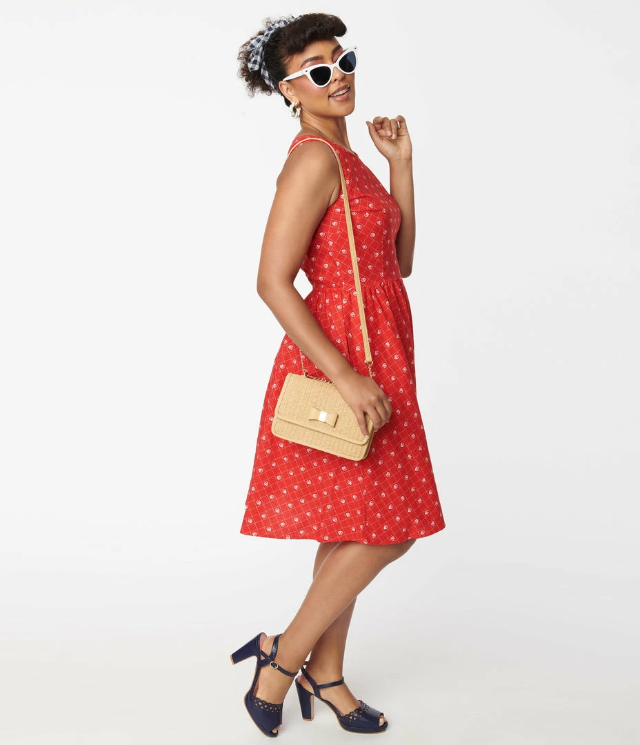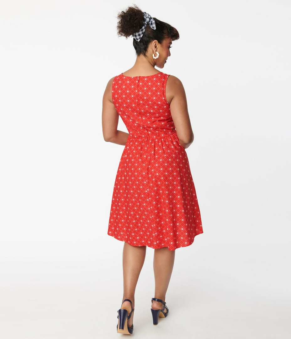 This delightful fit and flare dress from Retrolicious is crafted in cotton and features a sweet red and white windowpane pattern accented with white florals. The modest scoop neckline is framed by a sleeveless design, while the flare skirt has side pockets!