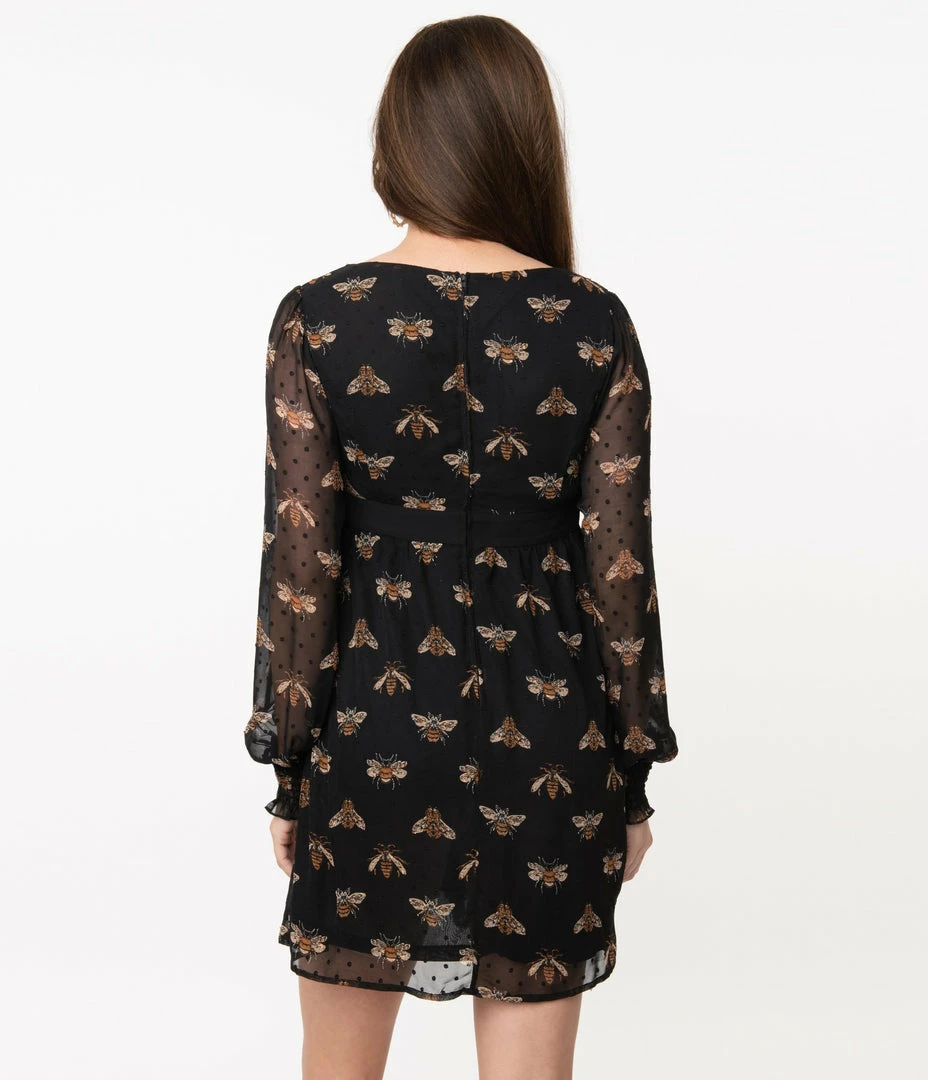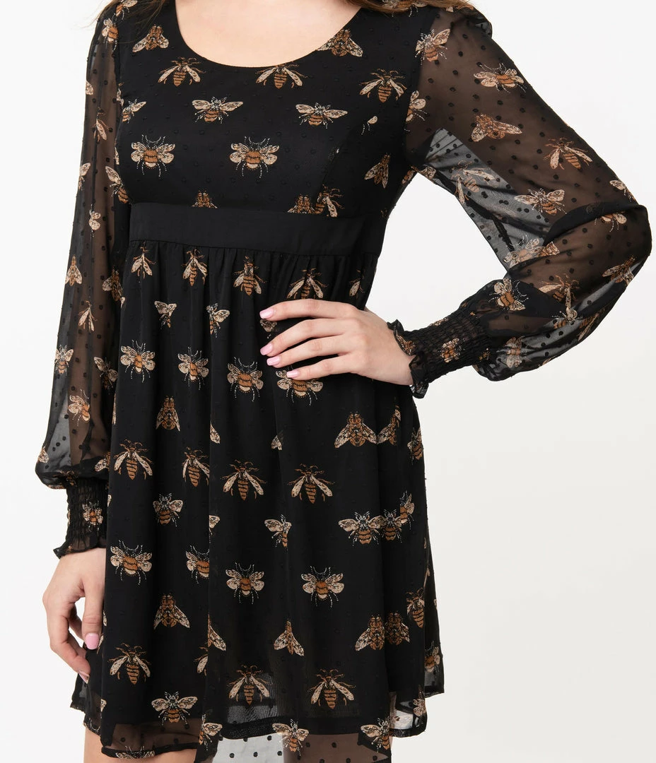 So good they can’t ignore you! A sweet mix of fabulous and honey, this stunning fit and flare dress from Smak Parlour is an eye-catching piece for a vintage maven. Crafted in a lightweight black chiffon with clip dots, your silhouette dances with an array of bees printed throughout. The scoop neckline is framed by lovely long sleeves that drop into smocked cuffs while the solid waistband sits high on your waist, cinched with a back zipper. Complete with a sweet flare skirt that dances above your knees and fully lined for comfort!