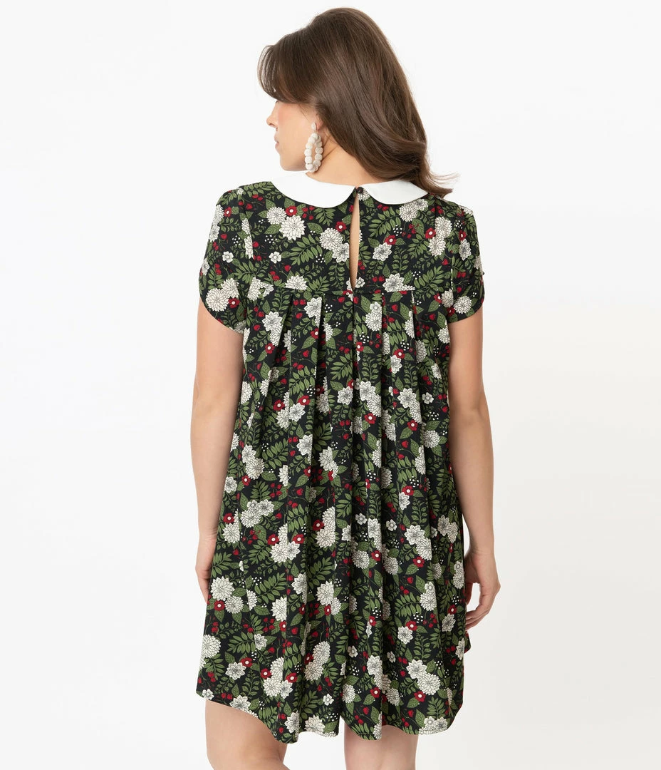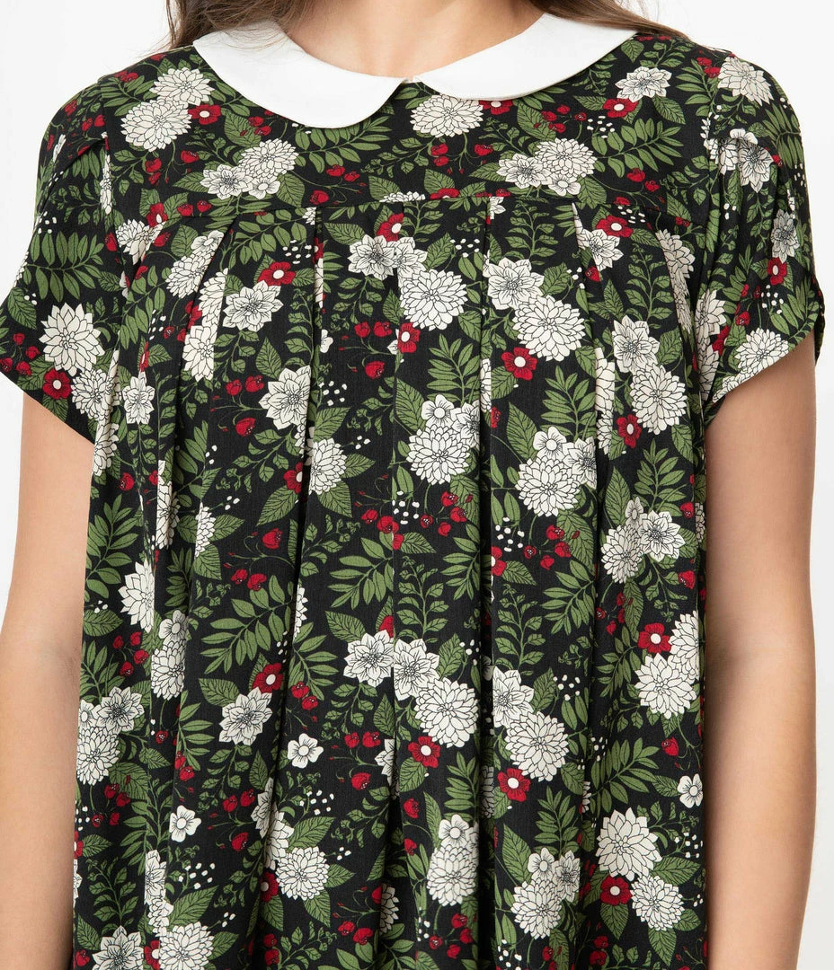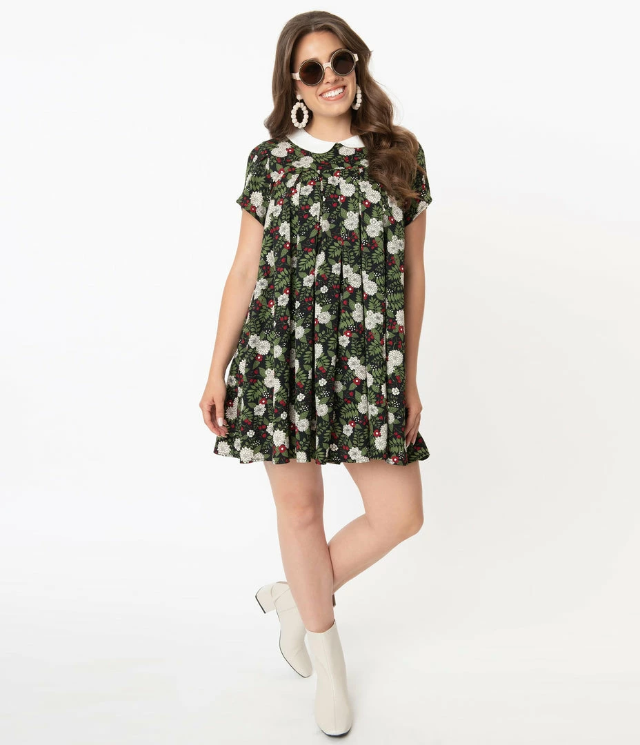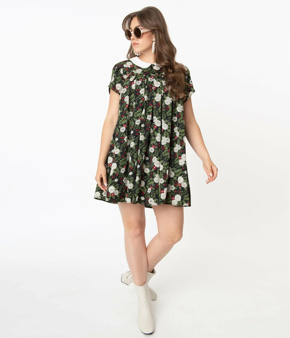 The essence of your dreams, dears! Frolic in vintage wonder with the Open Spaces Dress from Smak Parlour, a dreamy baby doll style, crafted in a lightweight woven fabric that dances with white and red florals and green leaves throughout the black backdrop. The high neckline is secured with a back button keyhole and embellished with a solid white Peter Pan collar and framed by short tulip sleeves. The yoke tops a pleated and casual silhouette that flows over your feminine form and dances high above your knees!