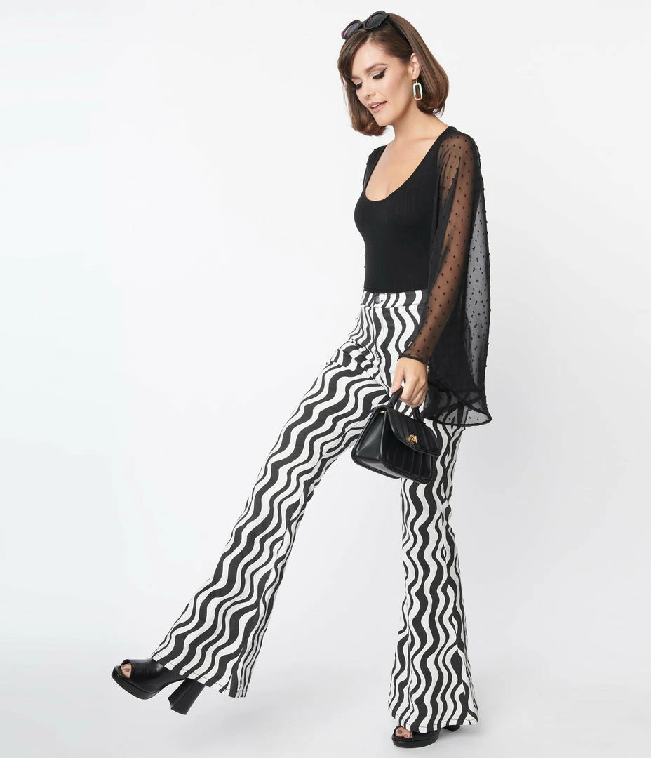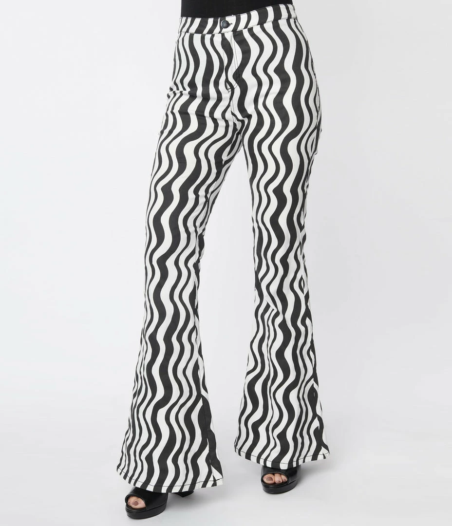 Crafted in marvelous denim that dances with black and white wavy stripes, and boasts an elegant high waist for a flattering silhouette. The banded waist is cinched with a front fly zipper and button as the retro legs drop into a dramatic flare for true retro styling, while the back pockets offer places to hold all your goodies!