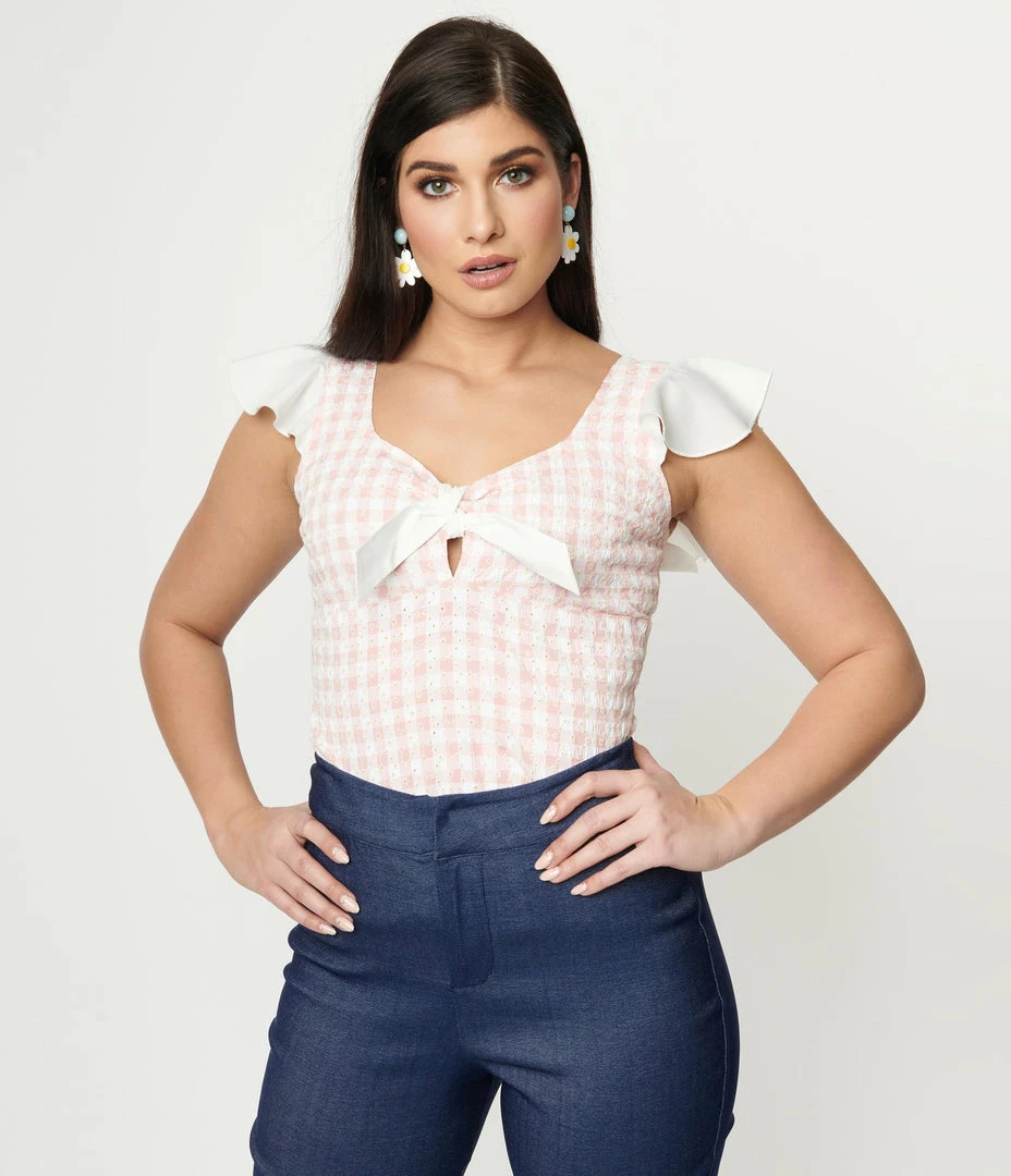 Let your ambitions fly, dears! This graceful top from Smak Parlour is a sweet separate for a vintage dame, crafted in a beautiful pink and white gingham seersucker fabric that dance with a white eyelet throughout. The sultry V-neckline is centered by a bow tie topped keyhole while the smocked back panel and adjustable straps provide a flattering fit. Complete with sweet ruffles for cap sleeves, double your major, double your worth!
