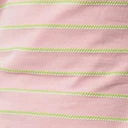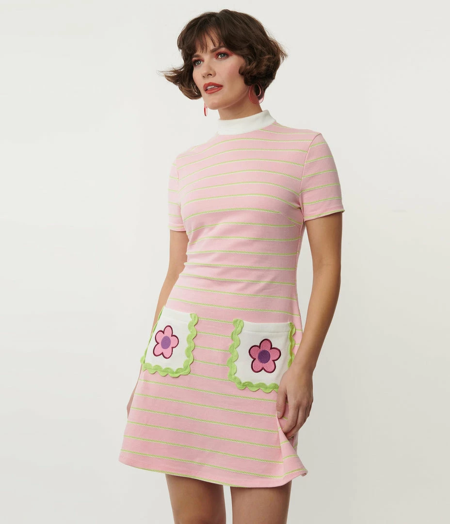 A striking shift dress crafted in a soft sturdy knit and set in a light pink silhouette with lime green and white stripes throughout. Outfitted with button back keyhole and side pockets.