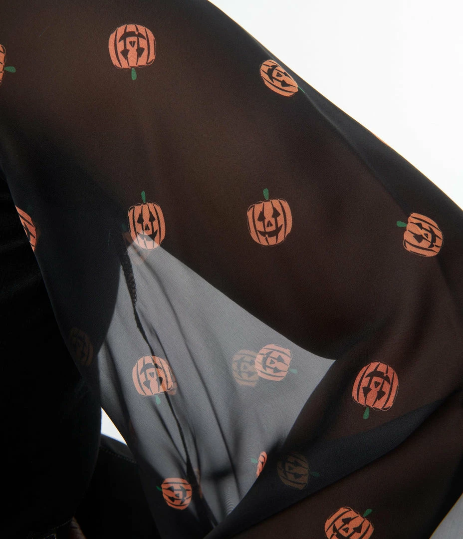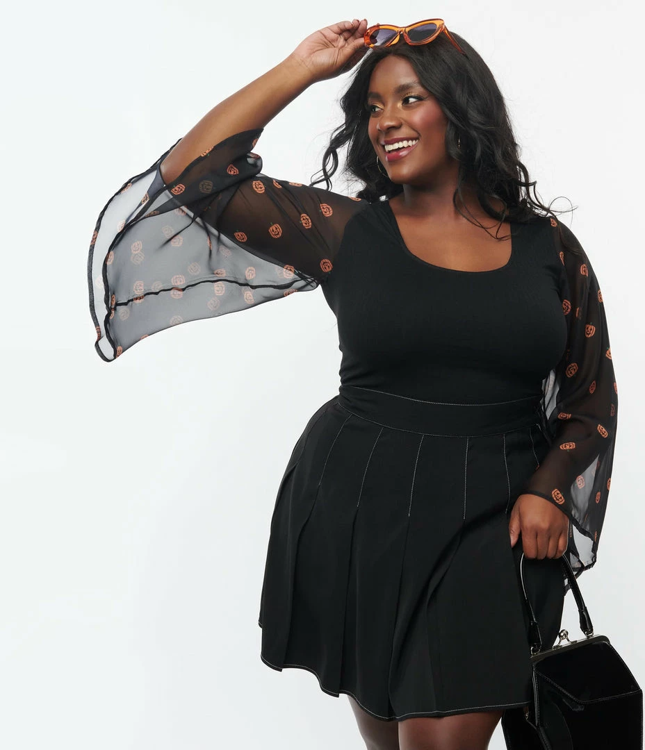 This frightening striking bodysuit is crafted in a soft black knit and features sheer long bell sleeves, dancing with orange jack-o-lantern pumpkins throughout. Complete with a scoop neckline and a five snap button closure.