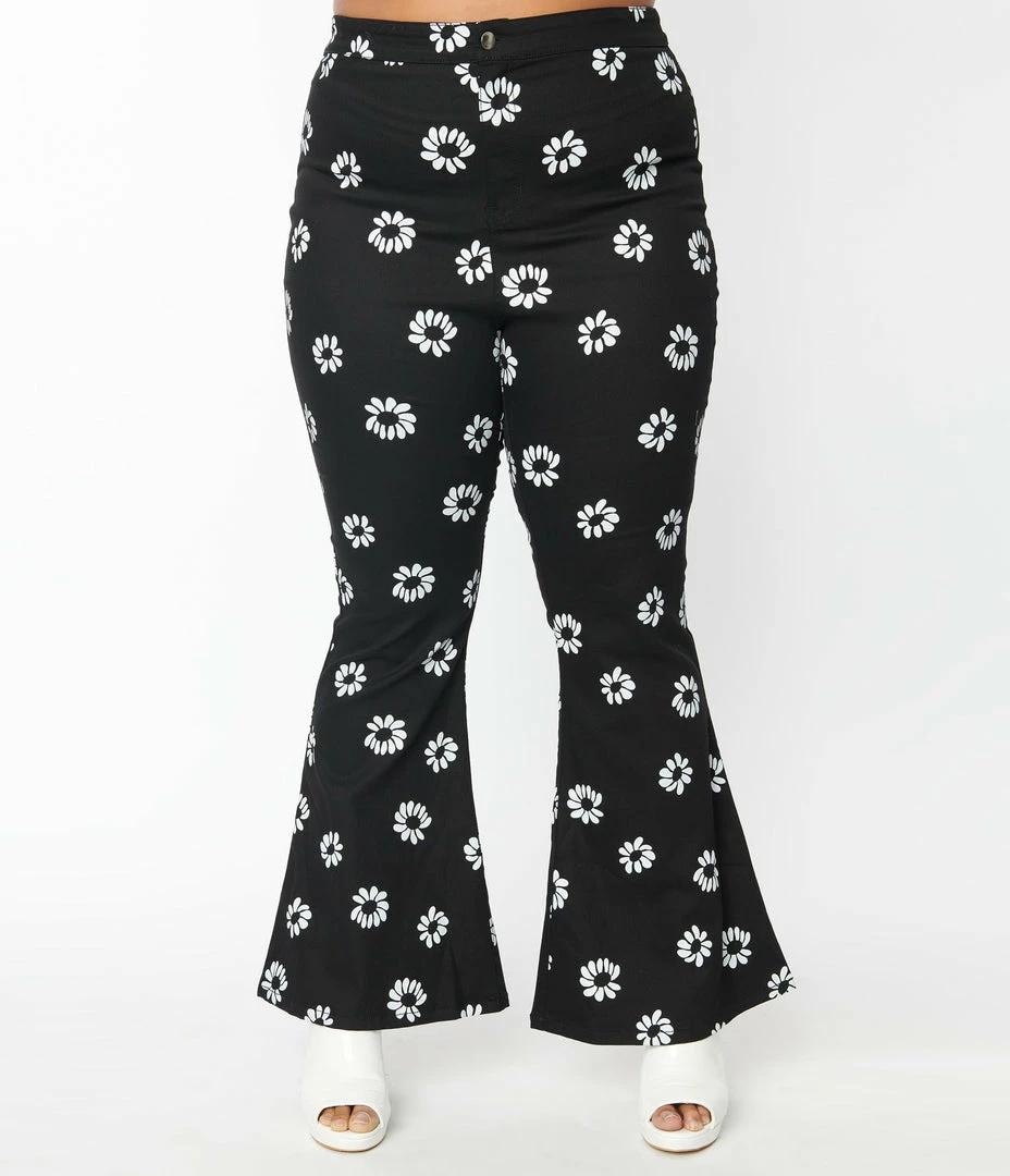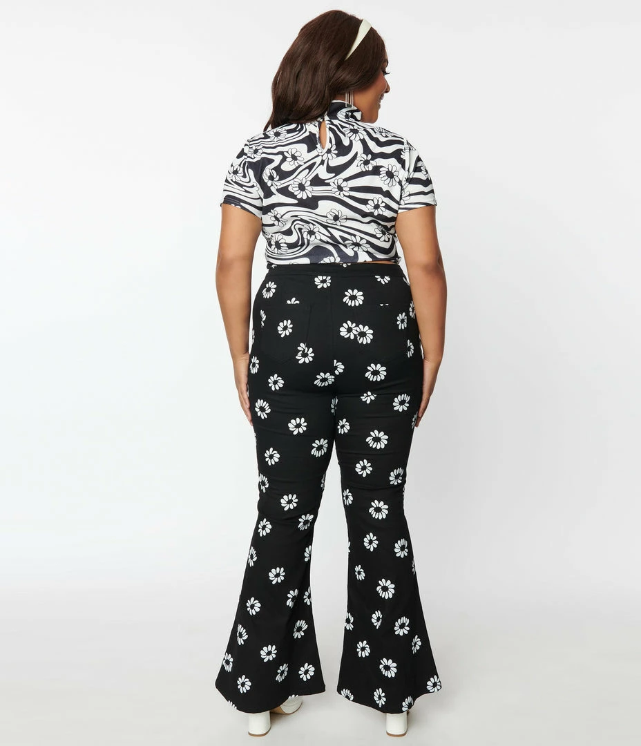 Crafted in marvelous black denim that dances with white florals, and boasts an elegant high waist for a flattering silhouette. The banded waist is cinched with a front fly zipper and button as the retro legs drop into a dramatic flare for true retro styling, while the back pockets offer places to hold all your goodies!