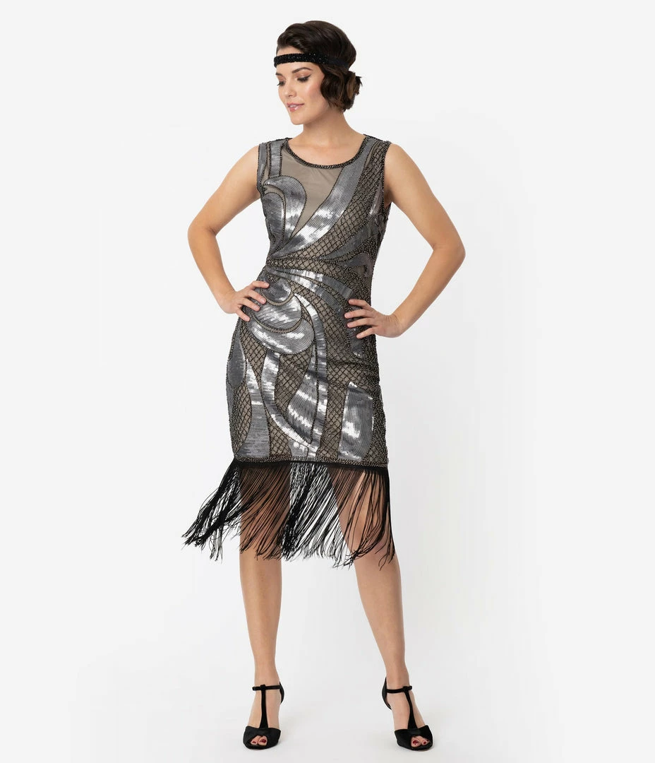 Sequins that sizzle, gals! Presenting an elegant flapper dress from Unique Vintage, the Annecy Dress sparkles and gleams with gunmetal sequins that swirl through your hourglass in fabulous deco design. A soft knit beige lining provides modern comfort as the black mesh is embellished with a black embroidered lattice pattern that twinkles with gunmetal beading. A scoop neckline and sleeveless bodice boast a fitted silhouette and above knee hemline that shimmies with long black fringe that globes past your knees. Zipping slyly up the side, itโs for spotlights only!
