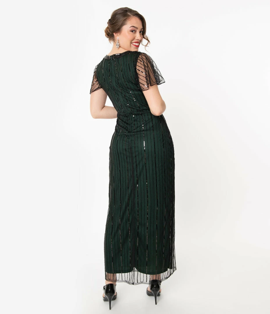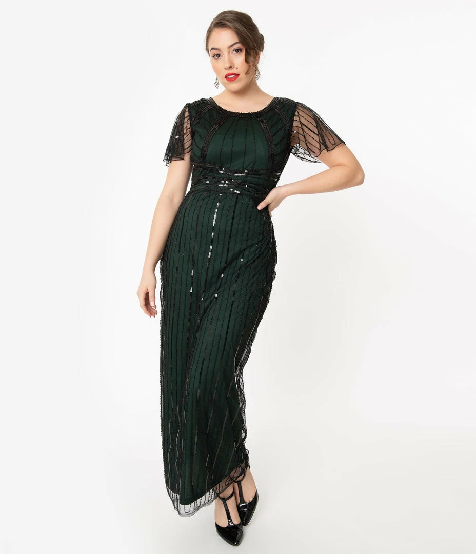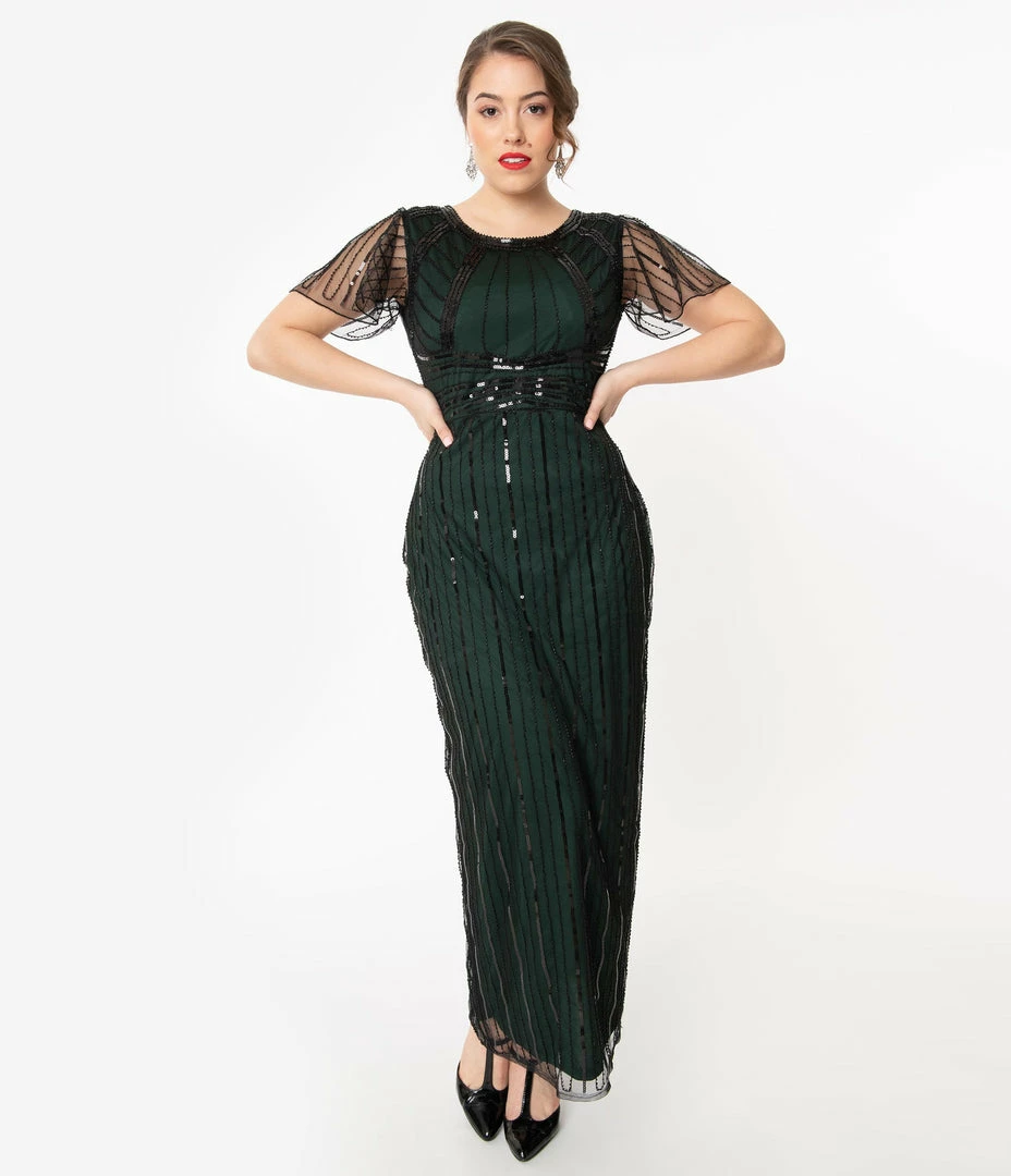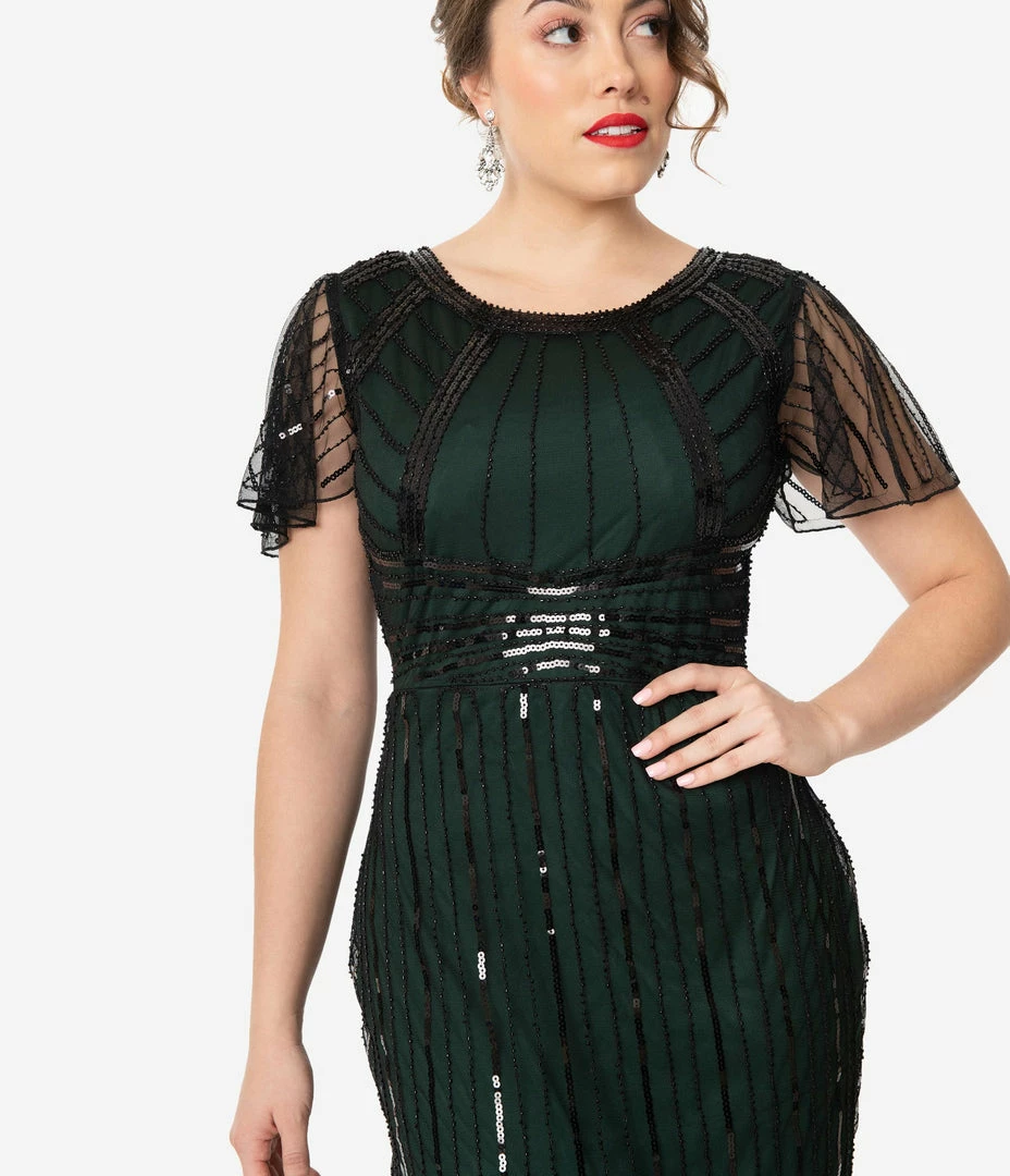 Shimmy in the moonlight, dames! An elegant long dress from Unique Vintage, the radiant Tess Gown is a stunning silhouette full of flapper accents. The comfortable emerald green knit lining features an overlay of black mesh that sparkles with black beading and sequin throughout. The modest scoop neckline is framed by graceful fluttering short sleeves while the fitted form drops to your ankles. Outfitted with a back zipper, weโre swept up in the glam!