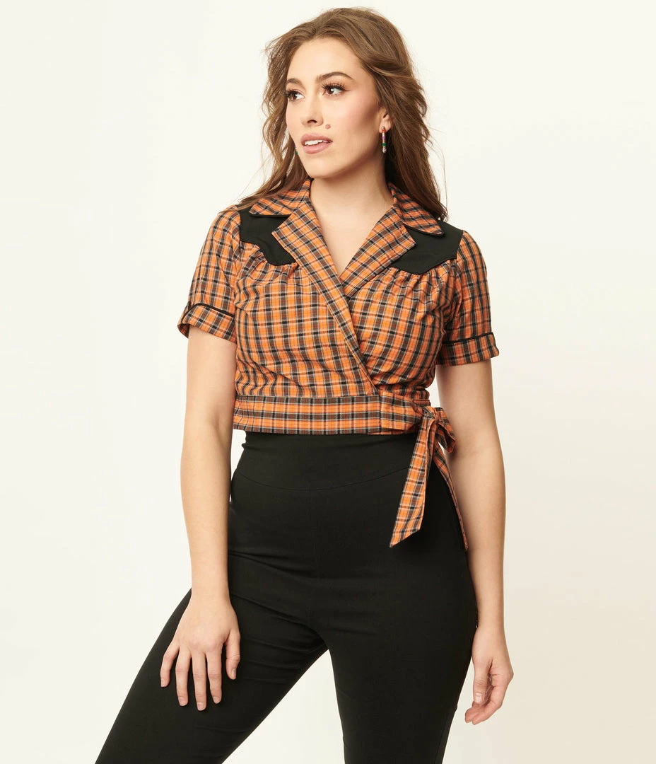 Flash Sale ๐ฏ Sale Unique Vintage 1950s Black & Orange Plaid Wrap Star Crop Top ๐ฏ