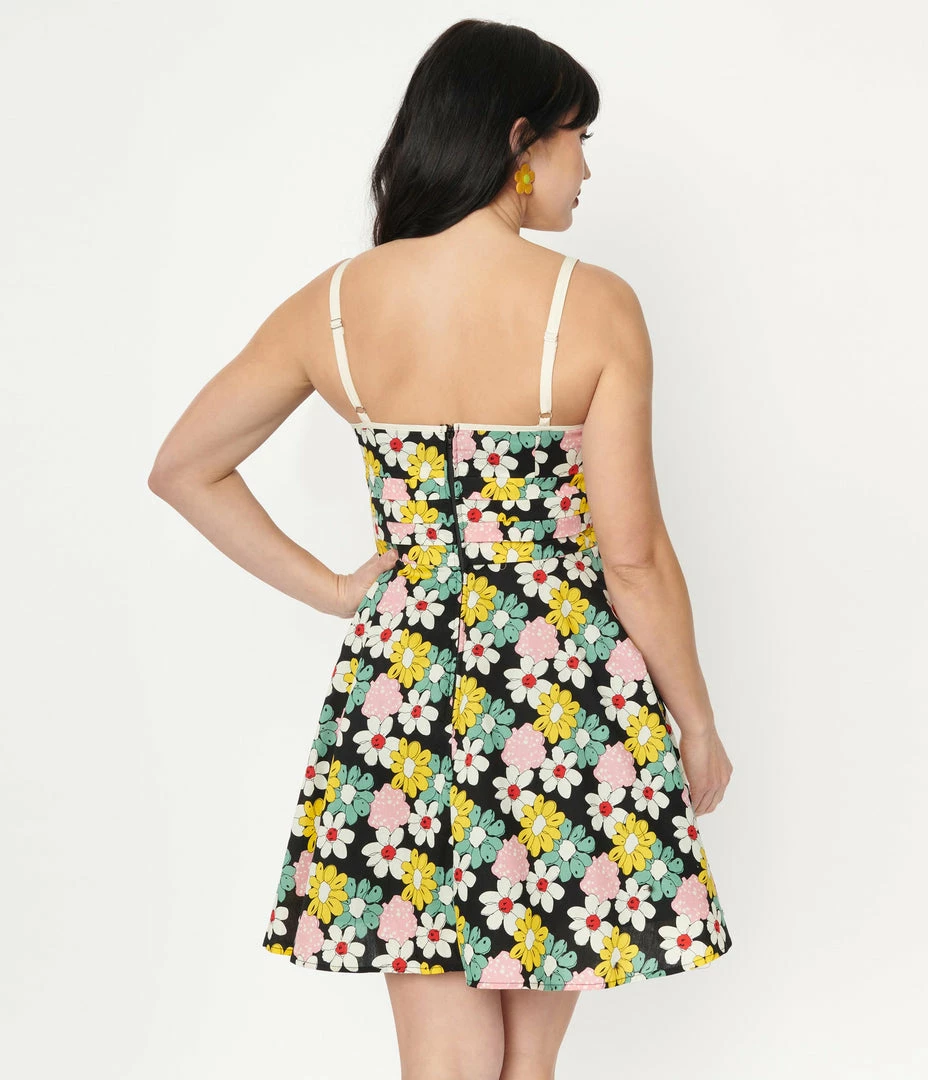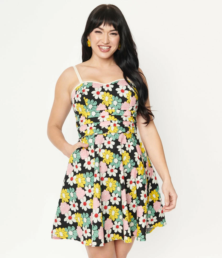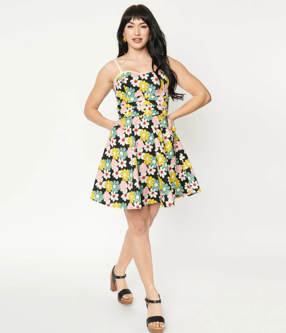 Playfully cute in a darling floral print that dances in yellow, pink, green, and white throughout a black backdrop, this sweet flare is crafted a lightweight woven fabric. Outfitted with adjustable spaghetti straps, a back zipper, and side pockets.