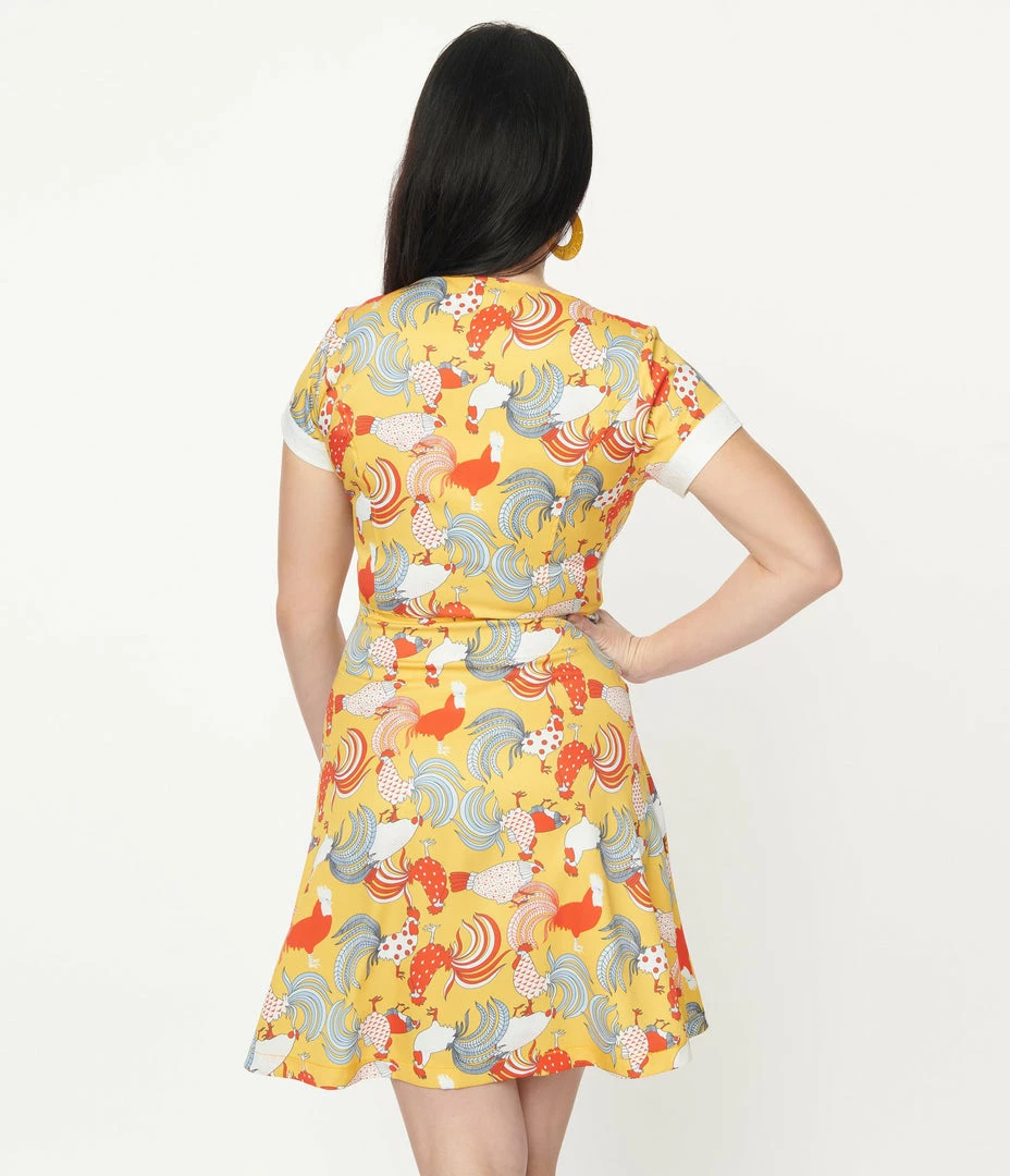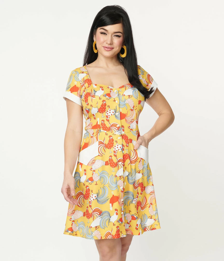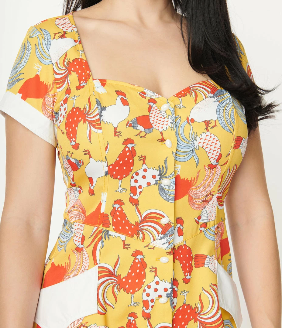 Flash Sale ✔️ Sale Unique Vintage 1950s Mustard & Red Rooster Print Fit & Flare 👗 Dress 😉